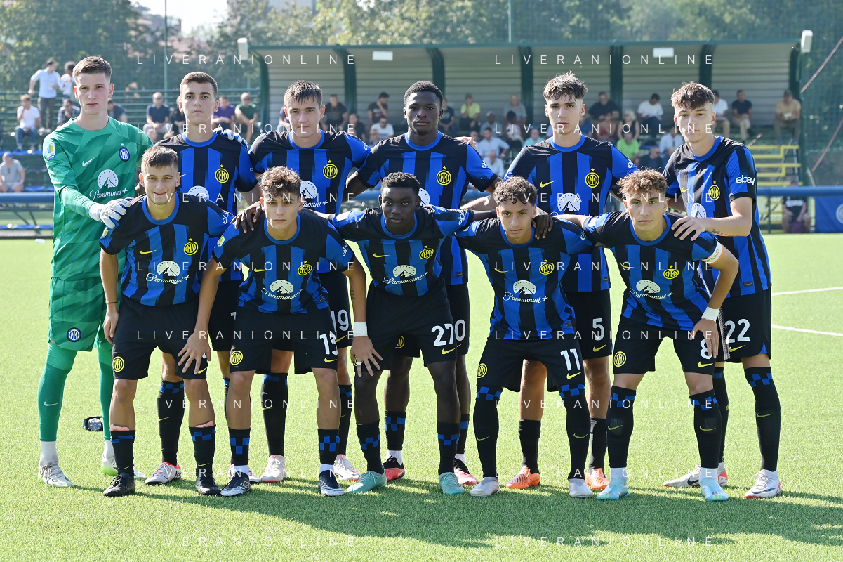 TVRG Inter vs Torino nella foto formazione Inter, in piedi da SX Alessandro Calligaris, Francesco Stante, Matjaz Samo, Issiaka Kamate, Leonardo Bovo e Matteo Spinacce'; in basso da SX Thomas Berenbruch, Matteo Motta, Mike Aidoo, Daniele Quieto e Luca Di Maggio Milano 29-09-2023 Konami Youth Development Centre in memoria di Giacinto Facchetti Campionato Primavera 1 TIM - 5a giornata foto Roberto Garavaglia/ag. Aldo Liverani sas