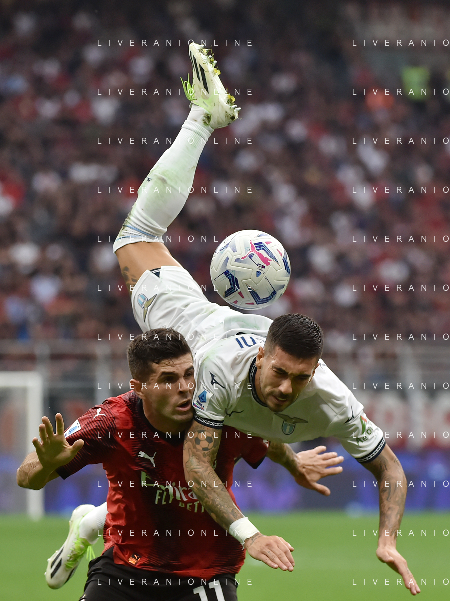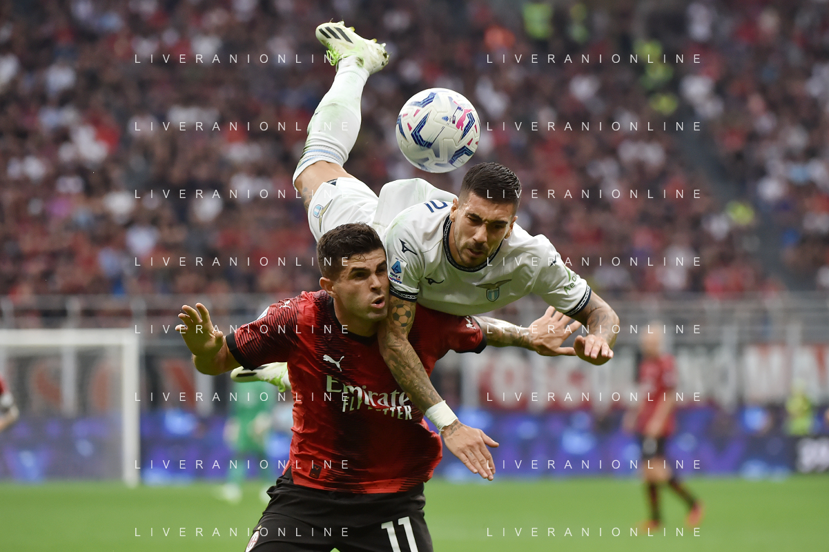 Milan vs Lazio nella foto Christian Mate Pulisic (Milan) e Mattia Zaccagni (Lazio) Milano 30-09-2023 Stadio Giuseppe Meazza - San Siro Campionato Serie A TIM - 7a giornata foto Roberto Garavaglia/ag. Aldo Liverani sas/AGENZIA ALDO LIVERANI SAS