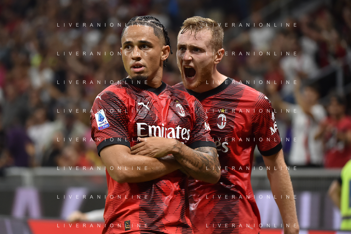 Milan vs Lazio nella foto Noah Okafor (Milan) e Tommaso Pobega (Milan) esultano dopo il gol del 2 a 0 Milano 30-09-2023 Stadio Giuseppe Meazza - San Siro Campionato Serie A TIM - 7a giornata foto Roberto Garavaglia/ag. Aldo Liverani sas/AGENZIA ALDO LIVERANI SAS