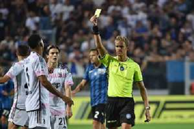 Atalanta vs Juventus nella foto l'arbitro Daniele Chiffi di Padova ammonisce Danilo Luiz Da Silva (Juventus) per il fallo su Charles de Ketelaere (Atalanta) Bergamo 01-10-2023 Gewiss Stadium - Stadio Atleti Azzurri d'Italia Campionato Serie A TIM - 7a giornata foto Roberto Garavaglia/ag. Aldo Liverani sas