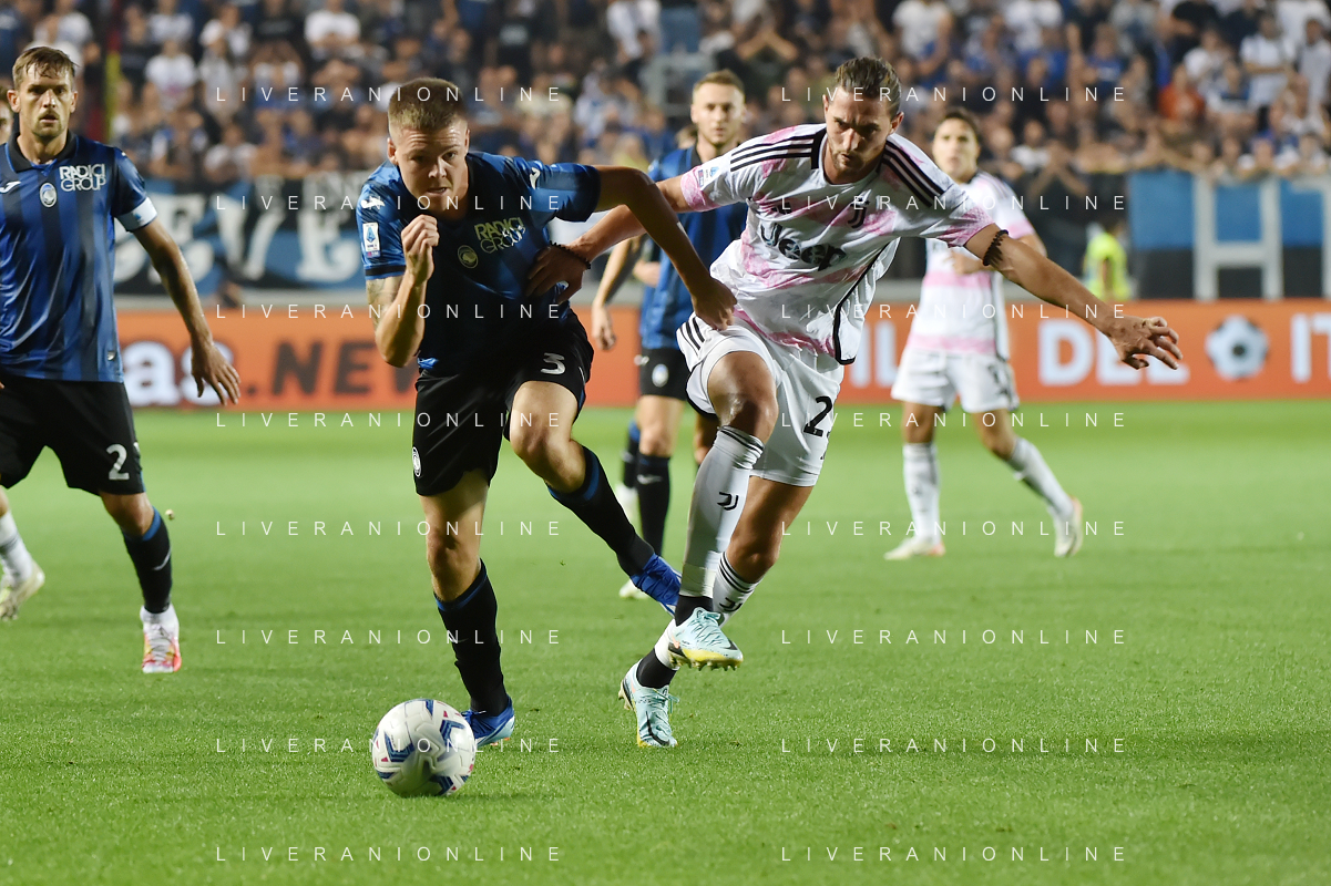 Atalanta vs Juventus nella foto Emil Holm (Atalanta) e Adrien Rabiot (Juventus) Bergamo 01-10-2023 Gewiss Stadium - Stadio Atleti Azzurri d'Italia Campionato Serie A TIM - 7a giornata foto Roberto Garavaglia/ag. Aldo Liverani sas