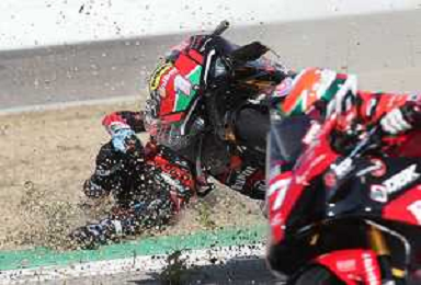 IMOLA 07 10 2023 AUTODROMO ENZO E DINO FERRARI CAMPIONATO ITALIANO VELOCITA' GARA 1 SUPERBIKE VINCITORE LORENZO ZANETTI NELLA FOTO LORENZO ZANETTI E LA CADUTA DI MICHELE PIRRO ALLA VARIANTE BASSA ©SANNA / AGENZIA ALDO LIVERANI SAS