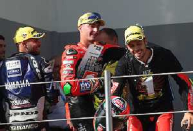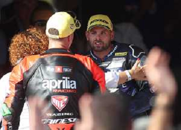 IMOLA 08 10 2023 AUTODROMO ENZO E DINO FERRARI CAMPIONATO ITALIANO VELOCITA' SUPERBIKE GARA DUE VINTA DA ALESSANDRO DELBIANCO LORENZO ZANETTI CAMPIONE ITALIANO NELLA FOTO LUCA BERNARDI E ALESSANDRO DELBIANCO FESTEGGIANO CON IL NUOVO CAMPIONE ITALIANO LORENZO ZANETTI FOTO GIANNI SANNA-AG ALDO LIVERANI SAS