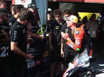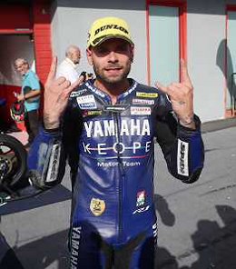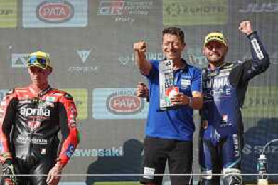 IMOLA 08 10 2023 AUTODROMO ENZO E DINO FERRARI CAMPIONATO ITALIANO VELOCITA' SUPERBIKE GARA DUE VINTA DA ALESSANDRO DELBIANCO LORENZO ZANETTI CAMPIONE ITALIANO NELLA FOTO ALESSANDRO DELBIANCO DOPO LA VITTORIA FOTO GIANNI SANNA-AG ALDO LIVERANI SAS