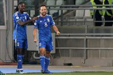 Davide Frattesi of Italy celebrates after scoring a goal with Manuel Locatelli of Italy during the UEFA EURO 2024 European qualifier match between Italy and Malta at Stadio San Nicola on October 14, 2023 in Bari, Italy. Photo by Emmanuele Mastrodonato/ag. Aldo Liverani sas