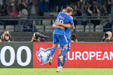 Domenico Berardi of Italy celebrates after scoring a goal with Nicolò Barella of Italy during the UEFA EURO 2024 European qualifier match between Italy and Malta at Stadio San Nicola on October 14, 2023 in Bari, Italy. Photo by Emmanuele Mastrodonato/ag. Aldo Liverani sas