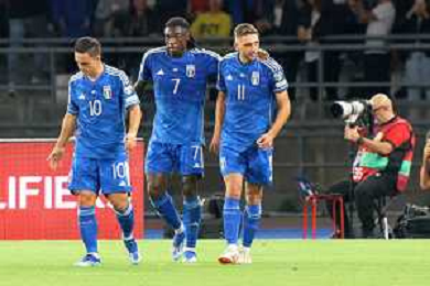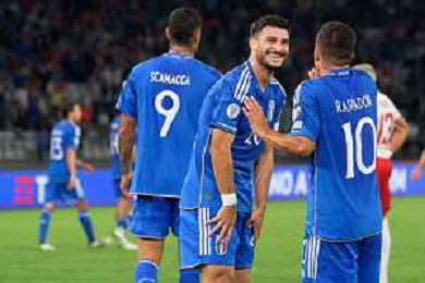 Domenico Berardi of Italy celebrates after scoring a goal with teammates during the UEFA EURO 2024 European qualifier match between Italy and Malta at Stadio San Nicola on October 14, 2023 in Bari, Italy. Photo by Emmanuele Mastrodonato/ag. Aldo Liverani sas