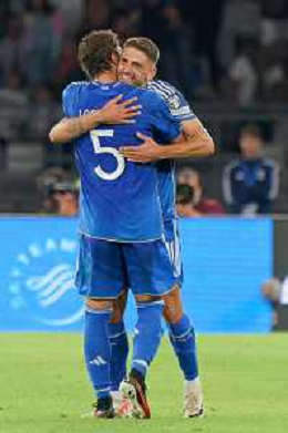 Davide Frattesi of Italy celebrates after scoring a goal with Gianluca Mancini of Italy during the UEFA EURO 2024 European qualifier match between Italy and Malta at Stadio San Nicola on October 14, 2023 in Bari, Italy. Photo by Emmanuele Mastrodonato/ag. Aldo Liverani sas