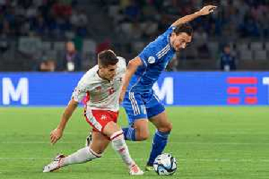 Domenico Berardi of Italy and Ryan Camenzuli of Malta during the UEFA EURO 2024 European qualifier match between Italy and Malta at Stadio San Nicola on October 14, 2023 in Bari, Italy. Photo by Emmanuele Mastrodonato/ag. Aldo Liverani sas