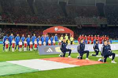 Italy and Malta teams lined up during the UEFA EURO 2024 European qualifier match between Italy and Malta at Stadio San Nicola on October 14, 2023 in Bari, Italy. Photo by Emmanuele Mastrodonato/ag. Aldo Liverani sas