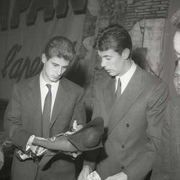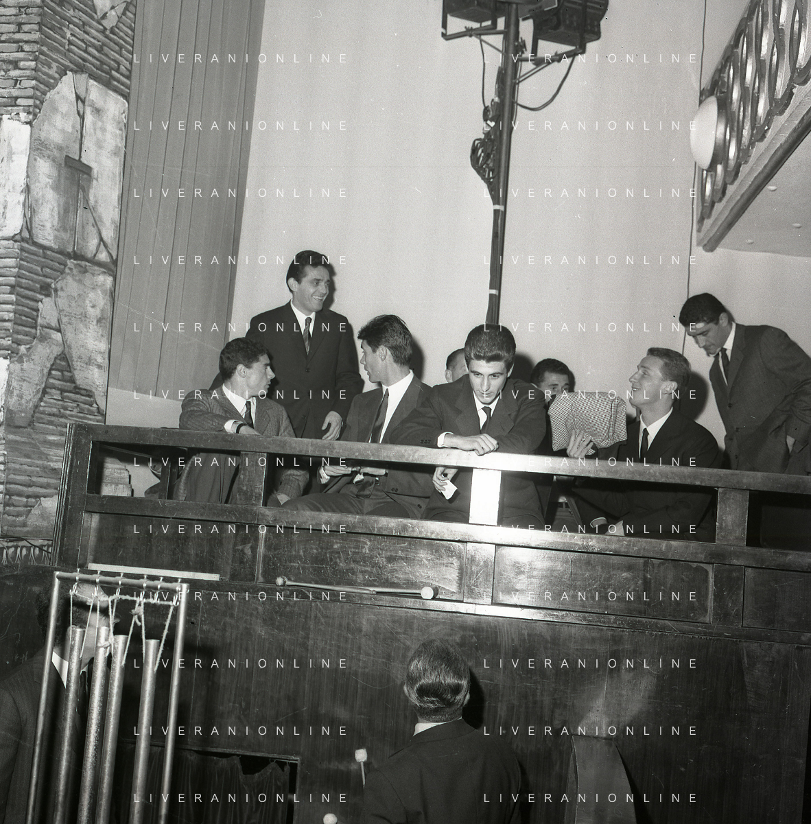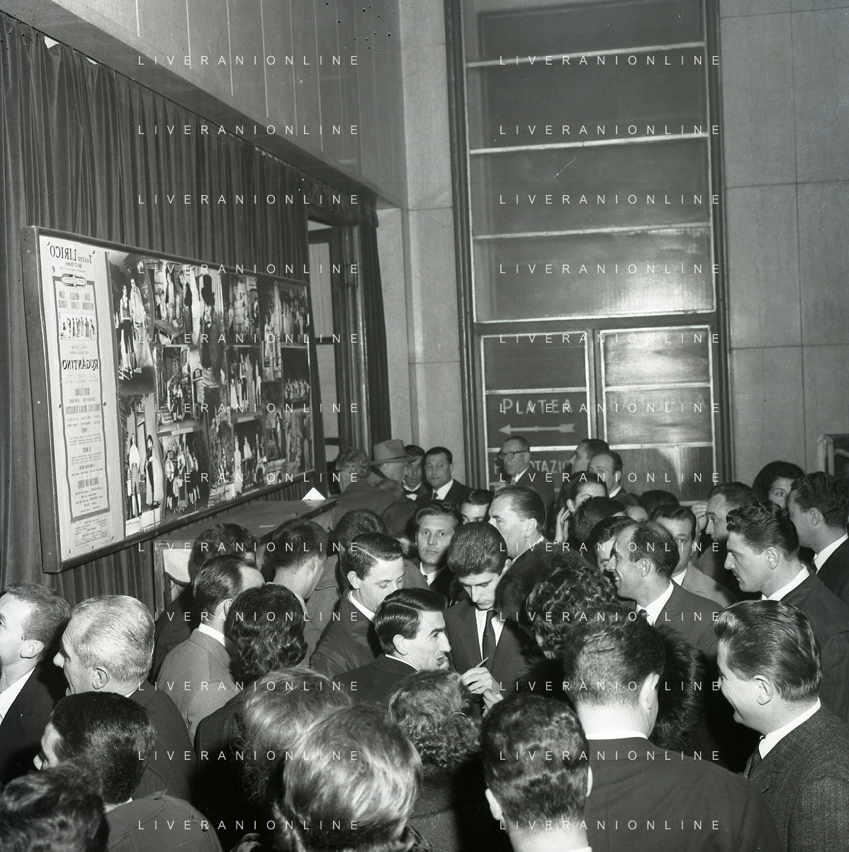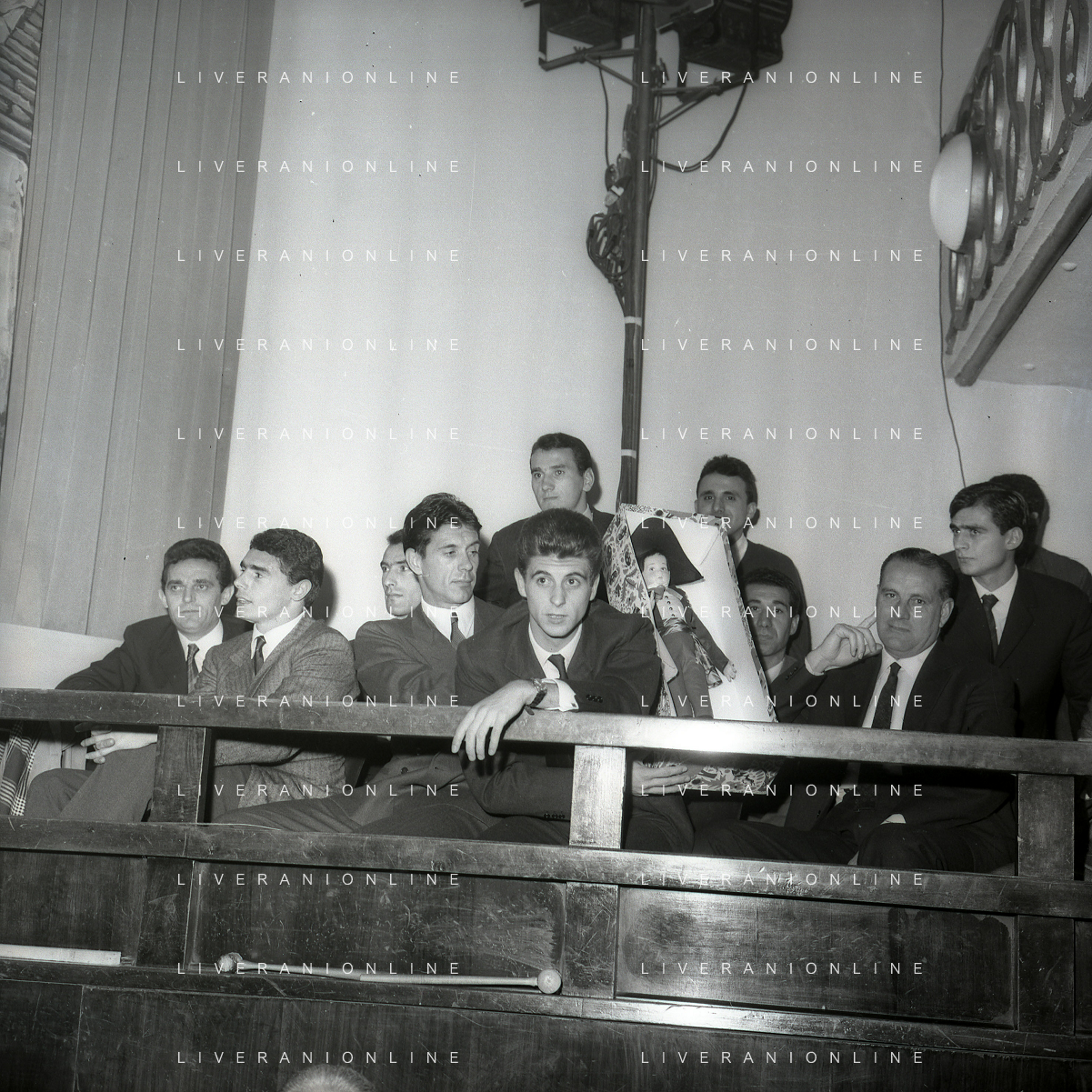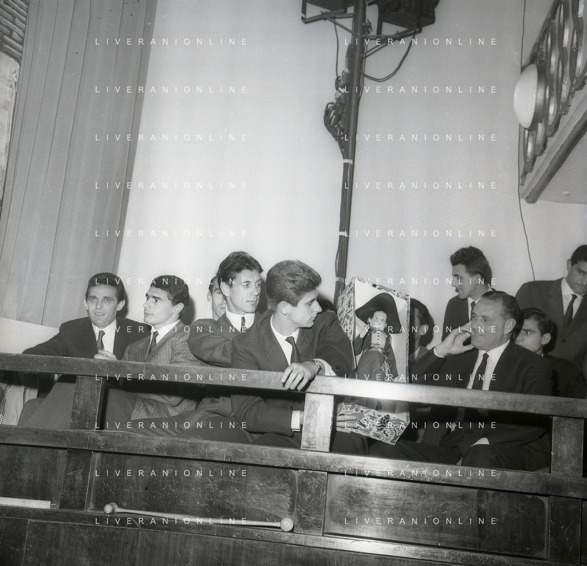 NEG-RETROSPETTIVA GIANNI RIVERA CALCIATORE NELLA FOTO GIANNI RIVERA COI COMPAGNI DI SQUADRA DEL MILAN PRESENZIANO ALLA PRIMA DELLA RIVISTA DEL RUGANTINO NELL'ANNO 1964 A MILANO AG ALDO LIVERANI SAS