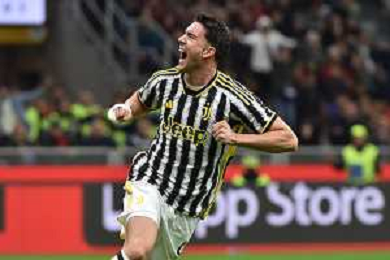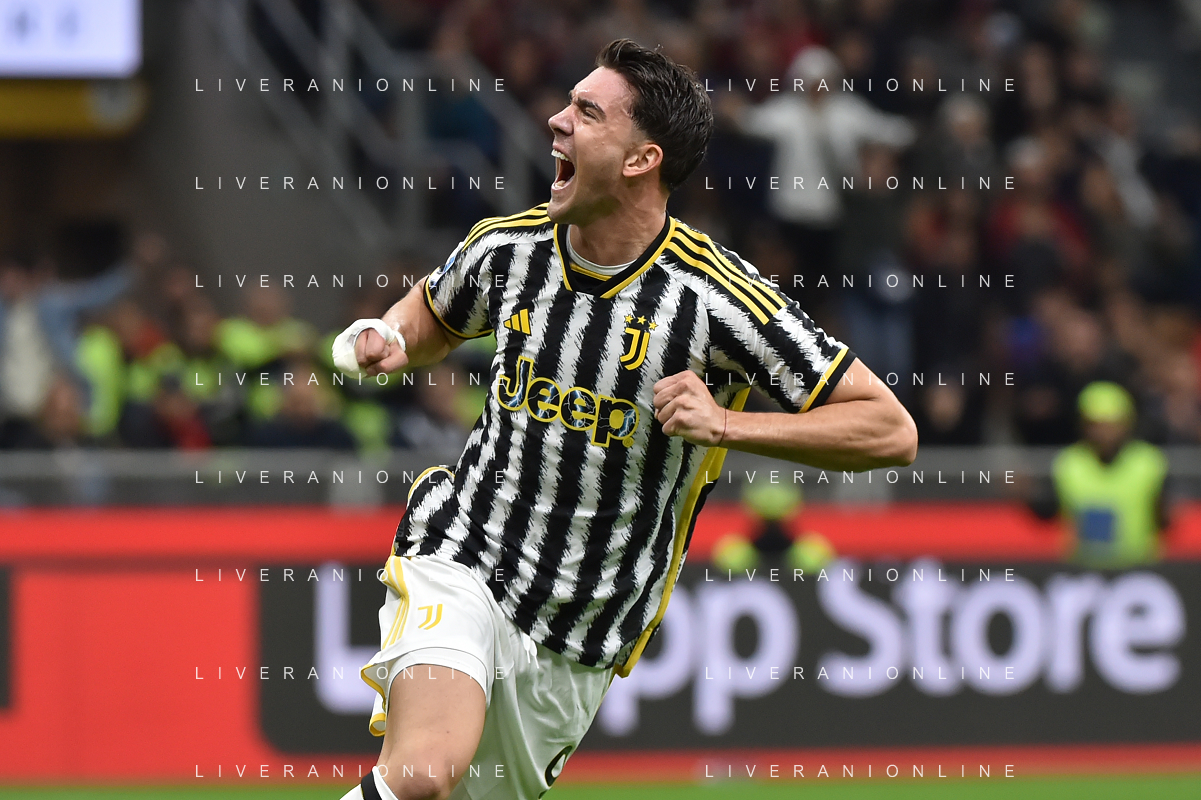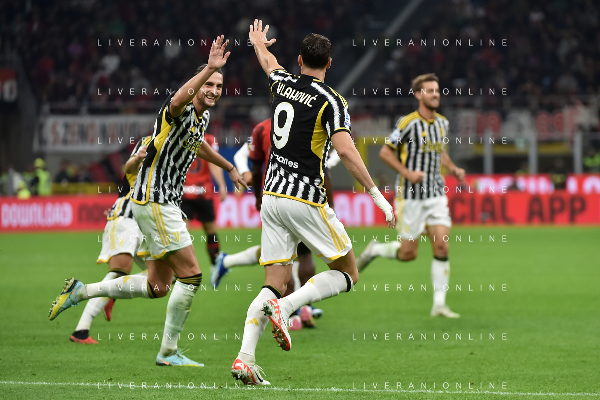 Milan vs Juventus nella foto Dusan Vlahovic (Juventus) esulta dopo il gol dell'1 a 0 segnato da Manuel Locatelli (Juventus) Milano 22-10-2023 Stadio Giuseppe Meazza - San Siro Campionato Serie A TIM - 9a giornata foto Roberto Garavaglia/ag. Aldo Liverani sas / AGENZIA ALDO LIVERANI SAS