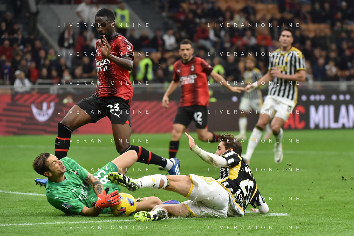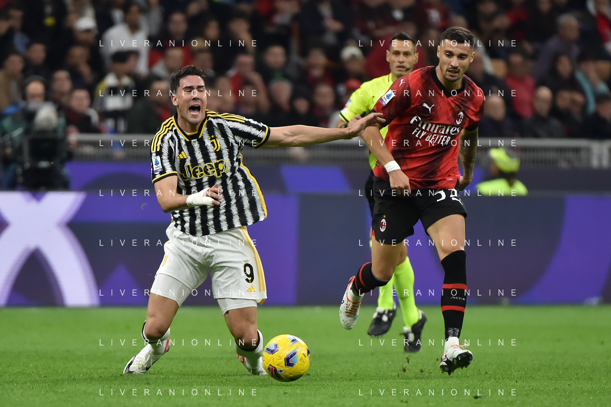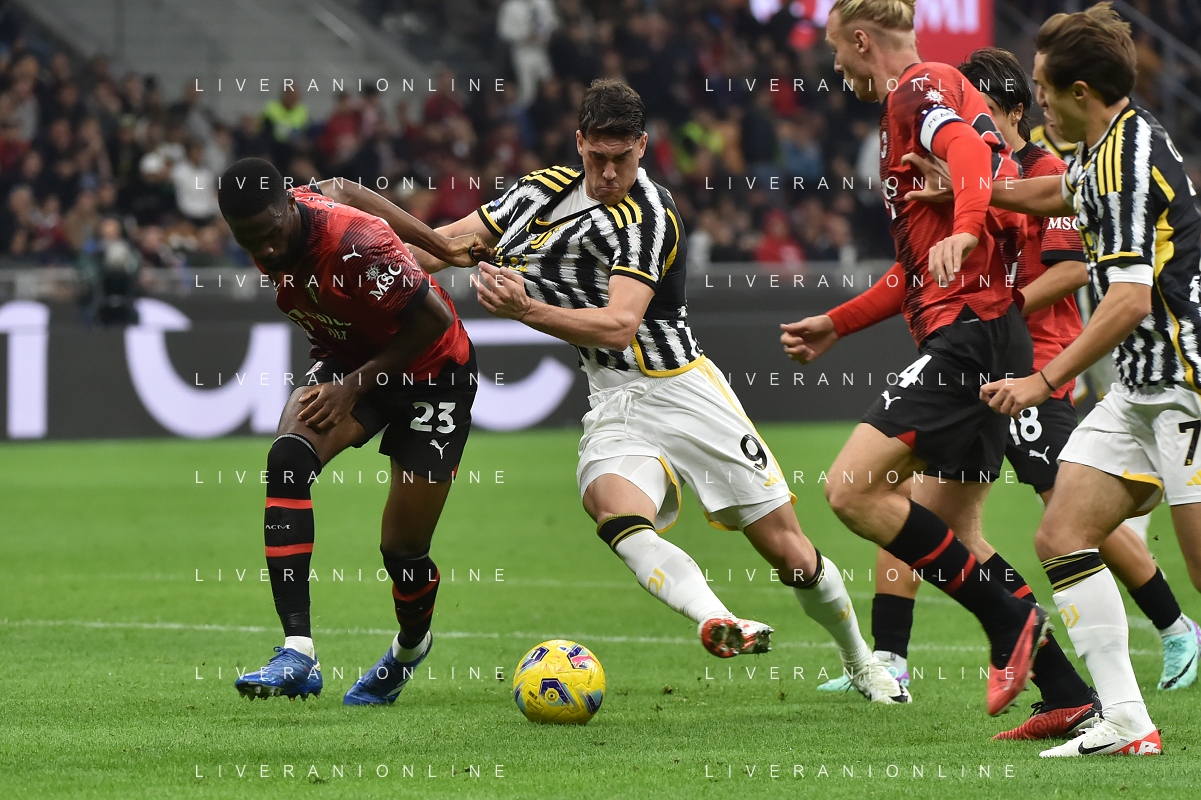 Milan vs Juventus nella foto Dusan Vlahovic (Juventus) e sulla SX Fikayo Tomori (Milan) Milano 22-10-2023 Stadio Giuseppe Meazza - San Siro Campionato Serie A TIM - 9a giornata foto Roberto Garavaglia/ag. Aldo Liverani sas / AGENZIA ALDO LIVERANI SAS
