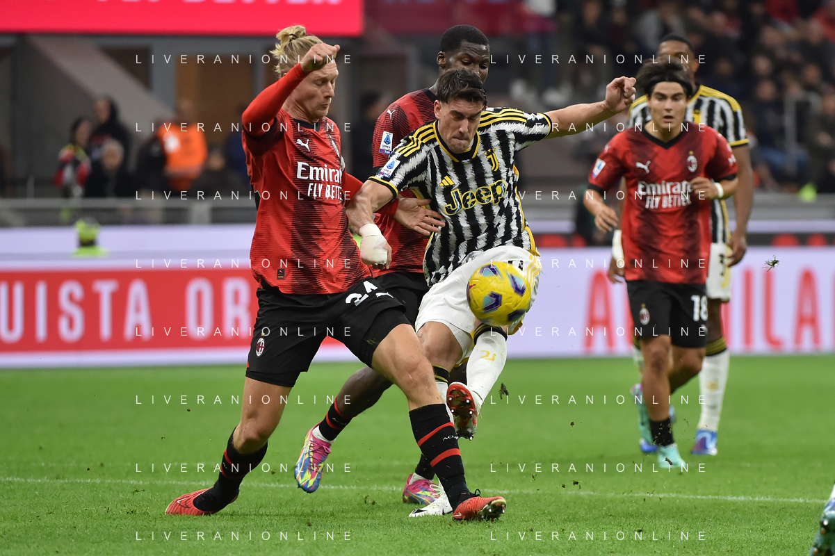 Milan vs Juventus nella foto Simon Kjaer (Milan) e Dusan Vlahovic (Juventus) Milano 22-10-2023 Stadio Giuseppe Meazza - San Siro Campionato Serie A TIM - 9a giornata foto Roberto Garavaglia/ag. Aldo Liverani sas / AGENZIA ALDO LIVERANI SAS