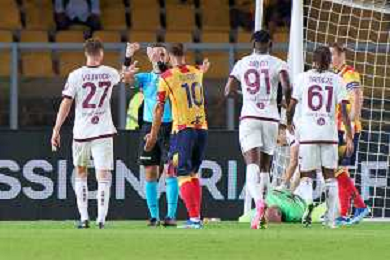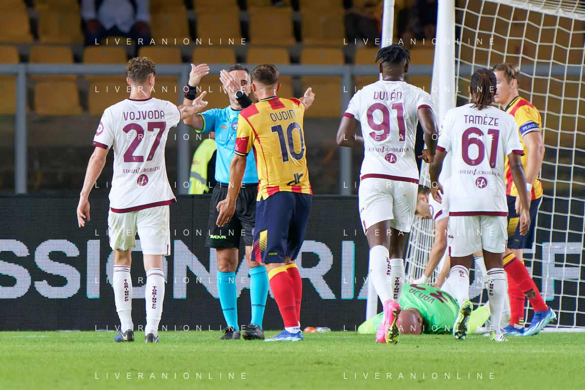 Remi Oudin of US Lecce protests with the referee Gianluca Aureliano of Bologna during the Italian soccer Serie A match US Lecce vs Torino FC on October 28, 2023 at Via del Mare Stadium in Lecce, Italy. Photo by Emmanuele Mastrodonato/ag. Aldo Liverani sas