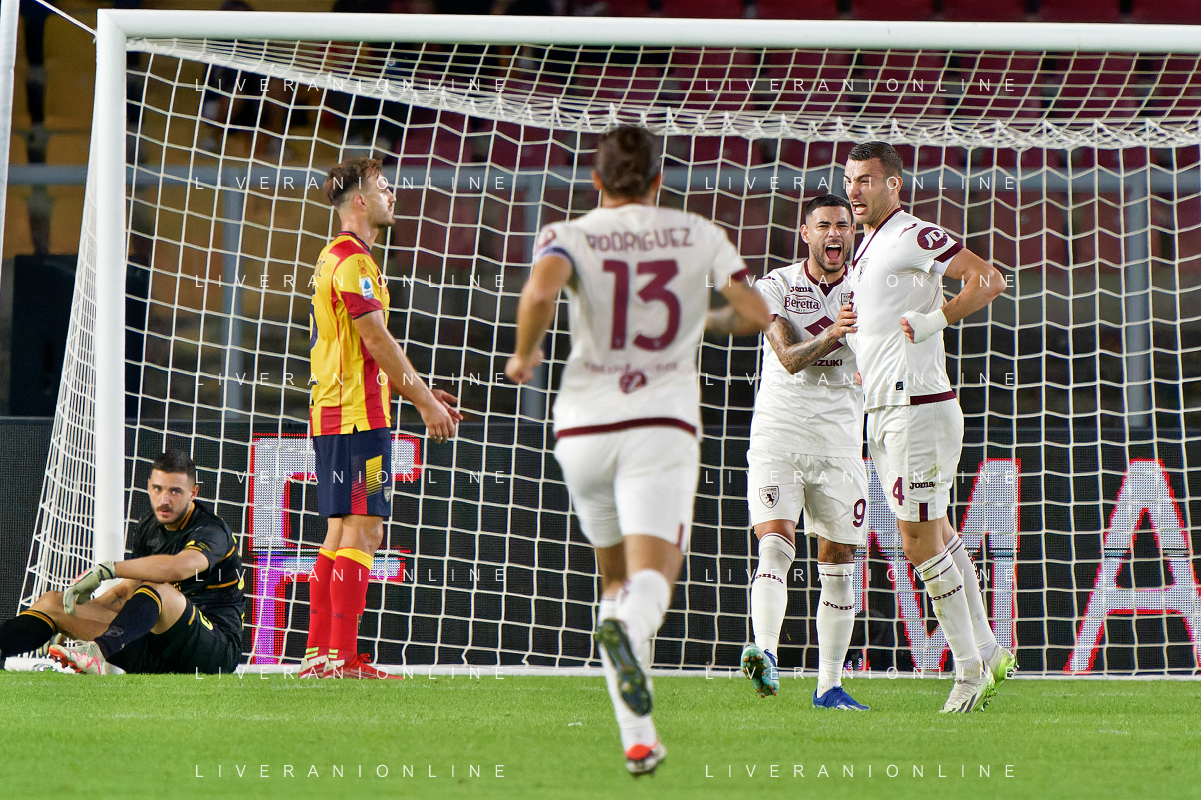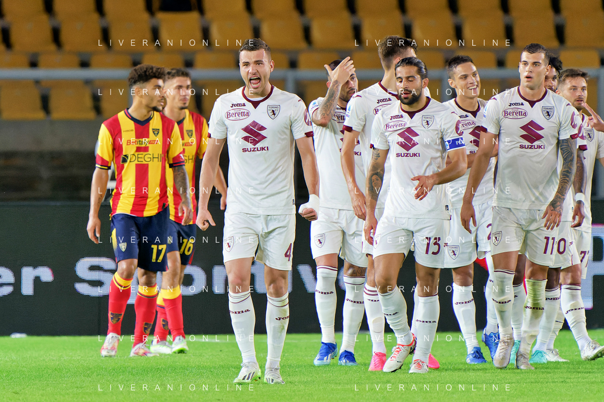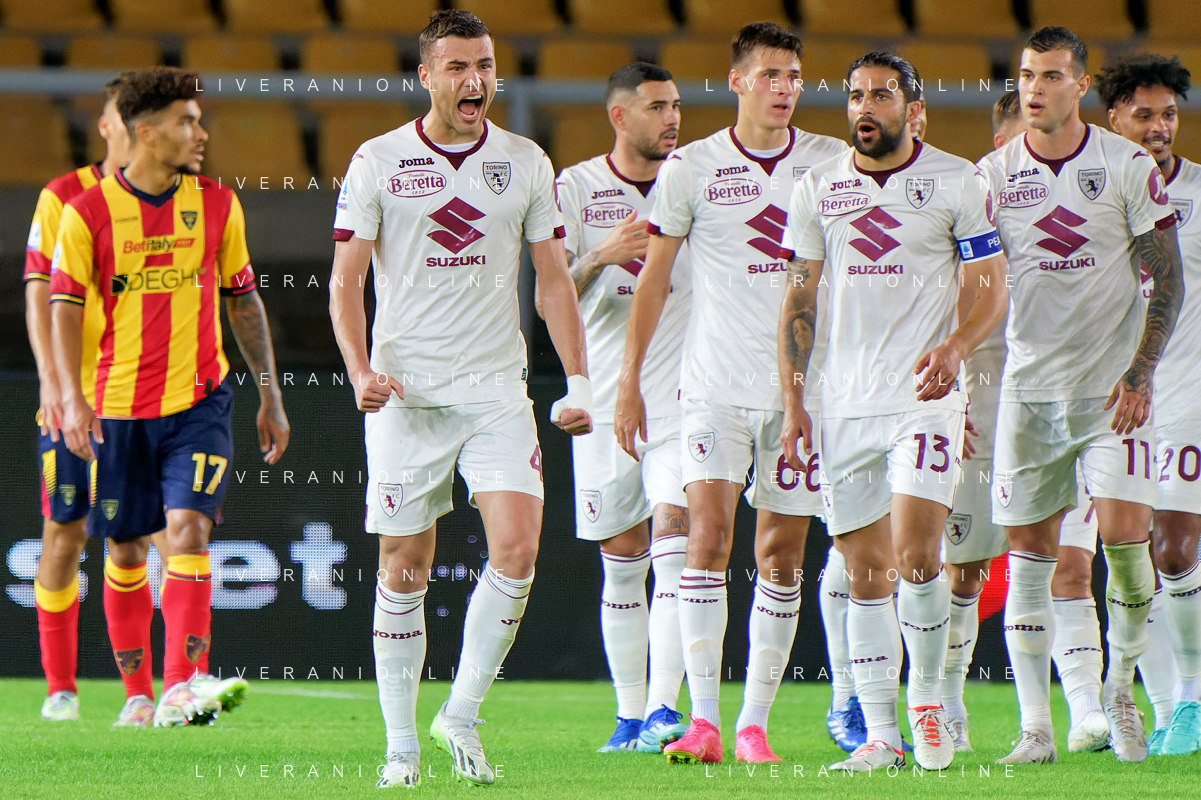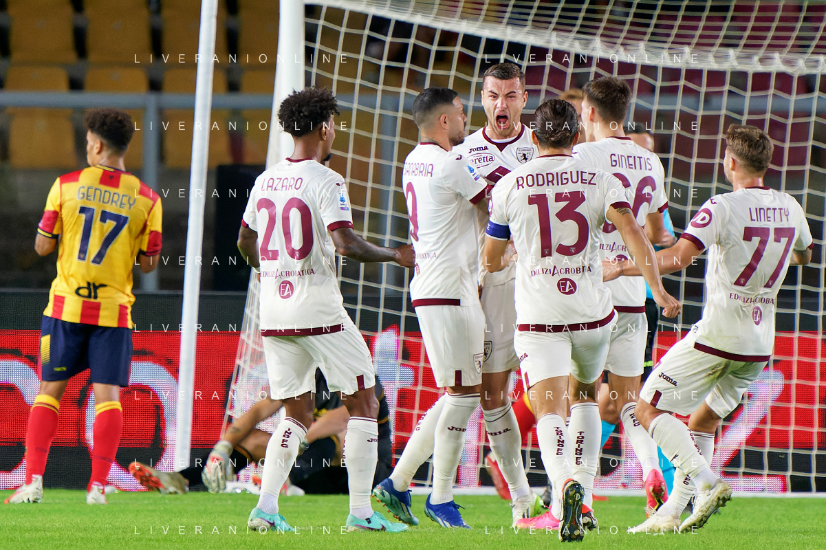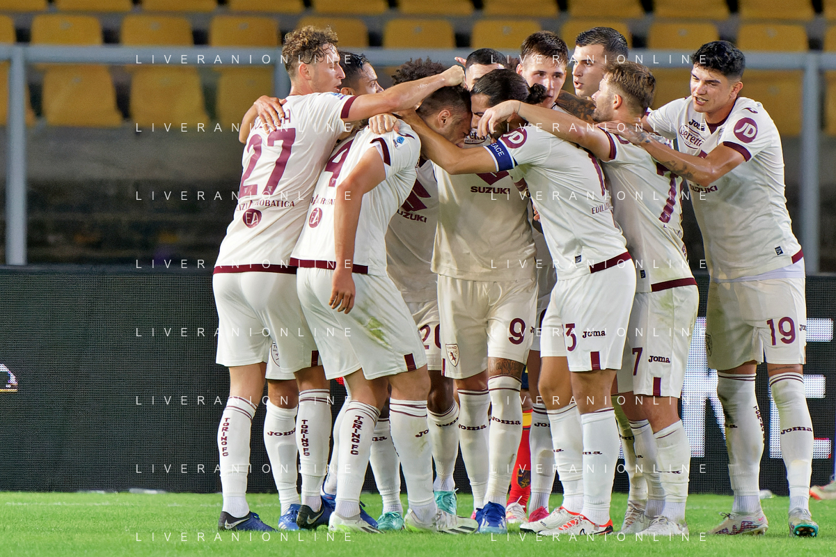 Alessandro Buongiorno of Torino FC celebrates after scoring a goal with teammates during the Italian soccer Serie A match US Lecce vs Torino FC on October 28, 2023 at Via del Mare Stadium in Lecce, Italy. Photo by Emmanuele Mastrodonato/ag. Aldo Liverani sas