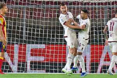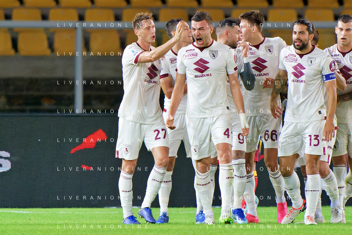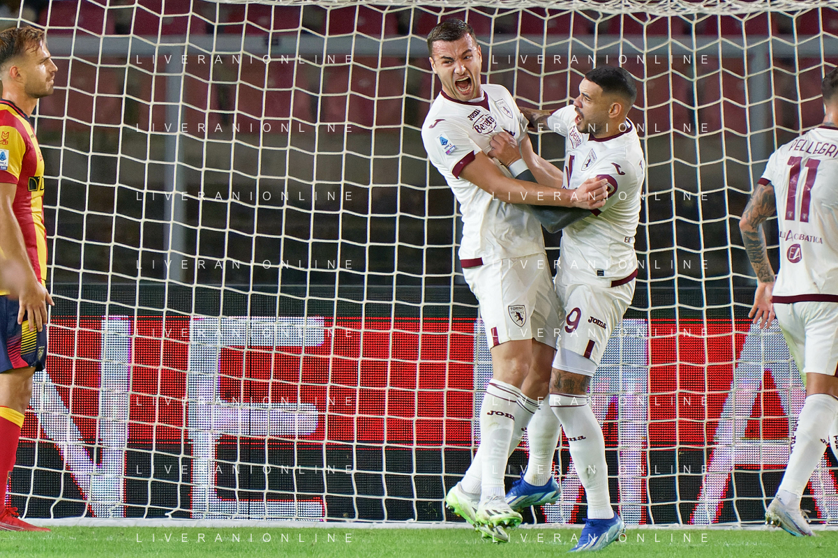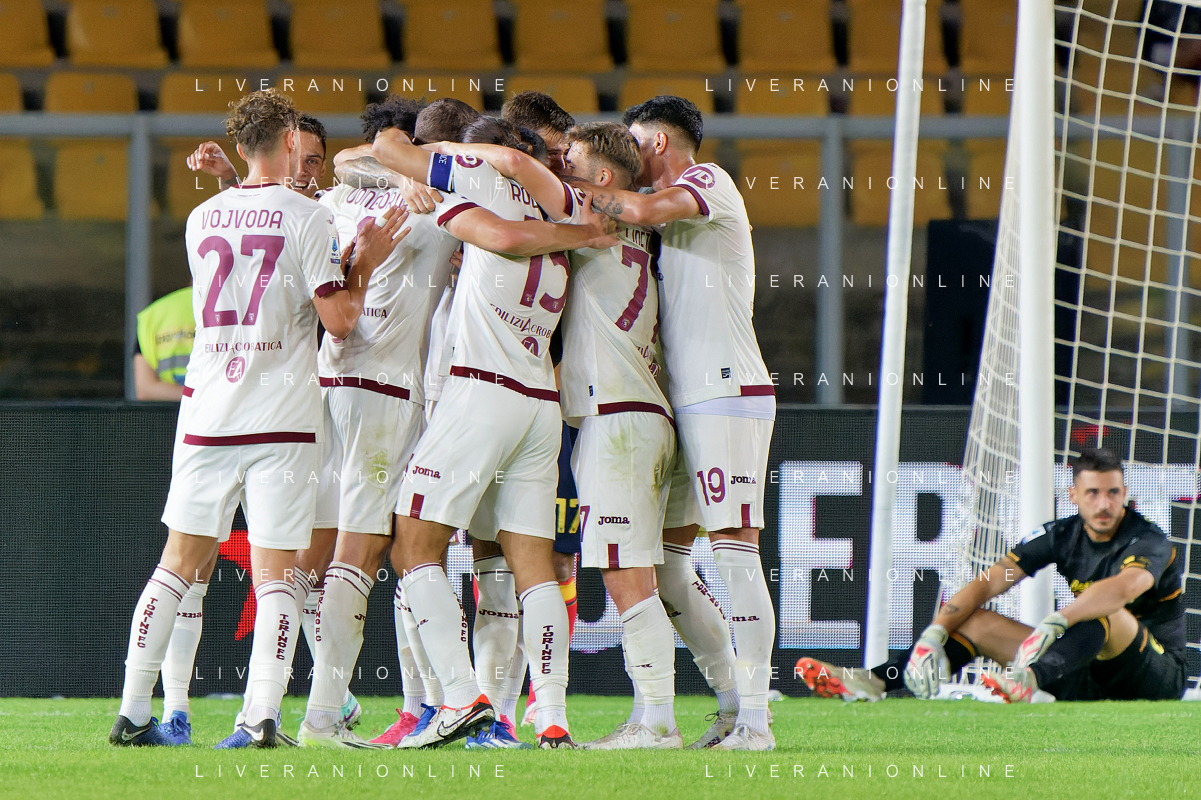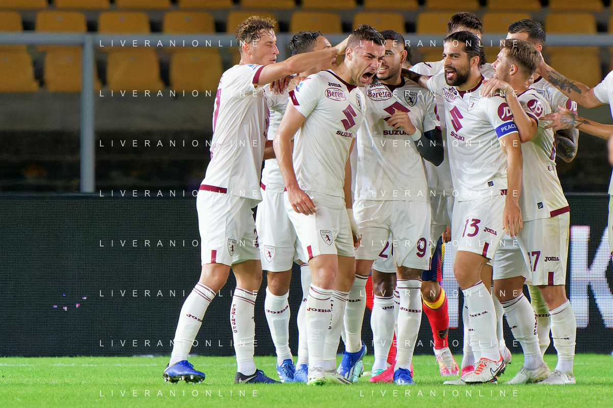 Alessandro Buongiorno of Torino FC celebrates after scoring a goal with teammates during the Italian soccer Serie A match US Lecce vs Torino FC on October 28, 2023 at Via del Mare Stadium in Lecce, Italy. Photo by Emmanuele Mastrodonato/ag. Aldo Liverani sas