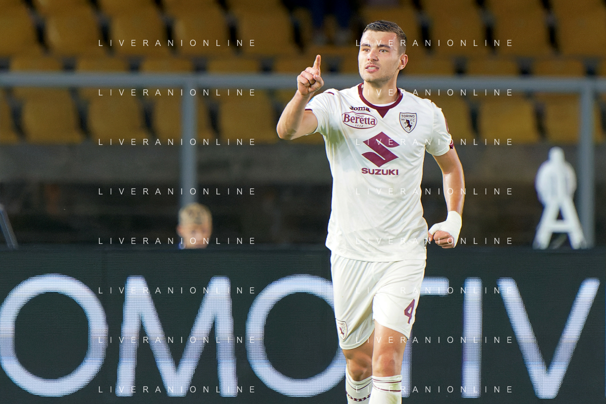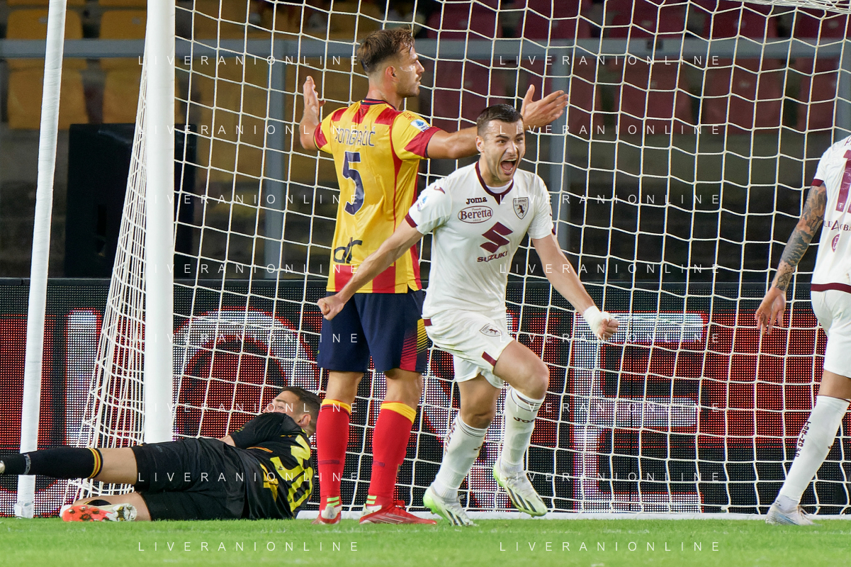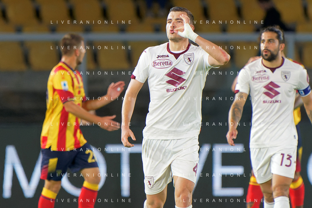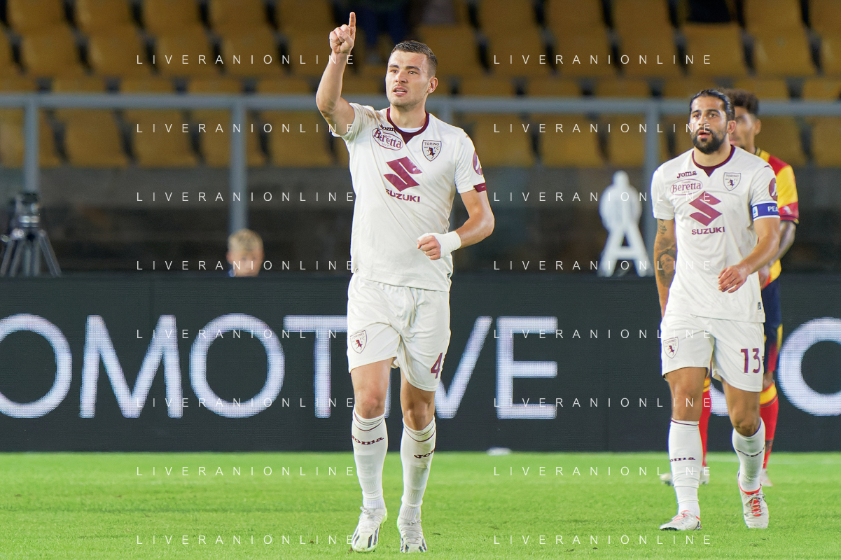 Alessandro Buongiorno of Torino FC celebrates after scoring a goal during the Italian soccer Serie A match US Lecce vs Torino FC on October 28, 2023 at Via del Mare Stadium in Lecce, Italy. Photo by Emmanuele Mastrodonato/ag. Aldo Liverani sas
