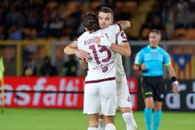Alessandro Buongiorno of Torino FC celebrates after scoring a goal with Ricardo Rodriguez of Torino FC during the Italian soccer Serie A match US Lecce vs Torino FC on October 28, 2023 at Via del Mare Stadium in Lecce, Italy. Photo by Emmanuele Mastrodonato/ag. Aldo Liverani sas