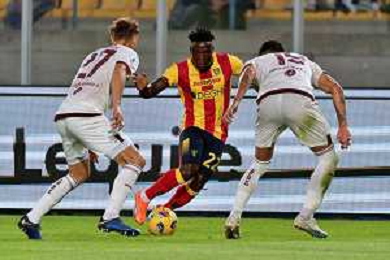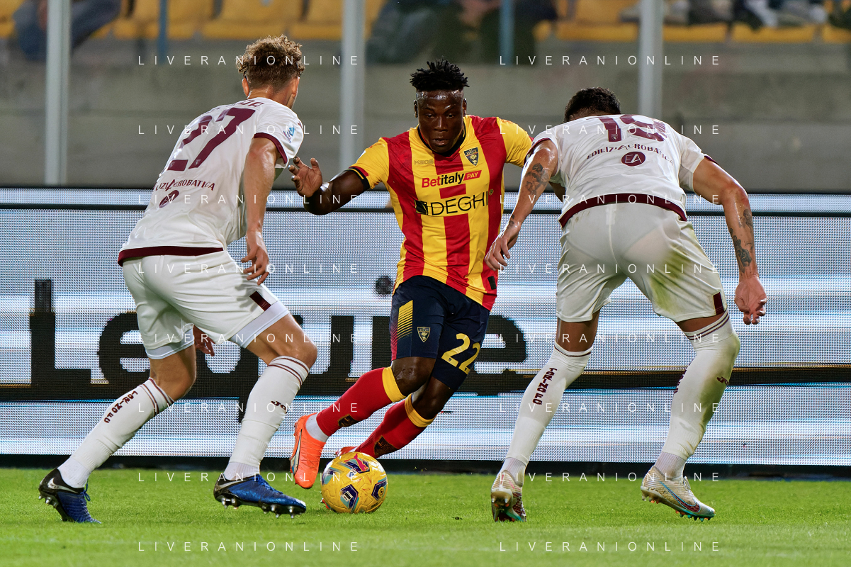 Lameck Banda of US Lecce and Mergim Vojvoda, Raoul Bellanova of Torino FC during the Italian soccer Serie A match US Lecce vs Torino FC on October 28, 2023 at Via del Mare Stadium in Lecce, Italy. Photo by Emmanuele Mastrodonato/ag. Aldo Liverani sas