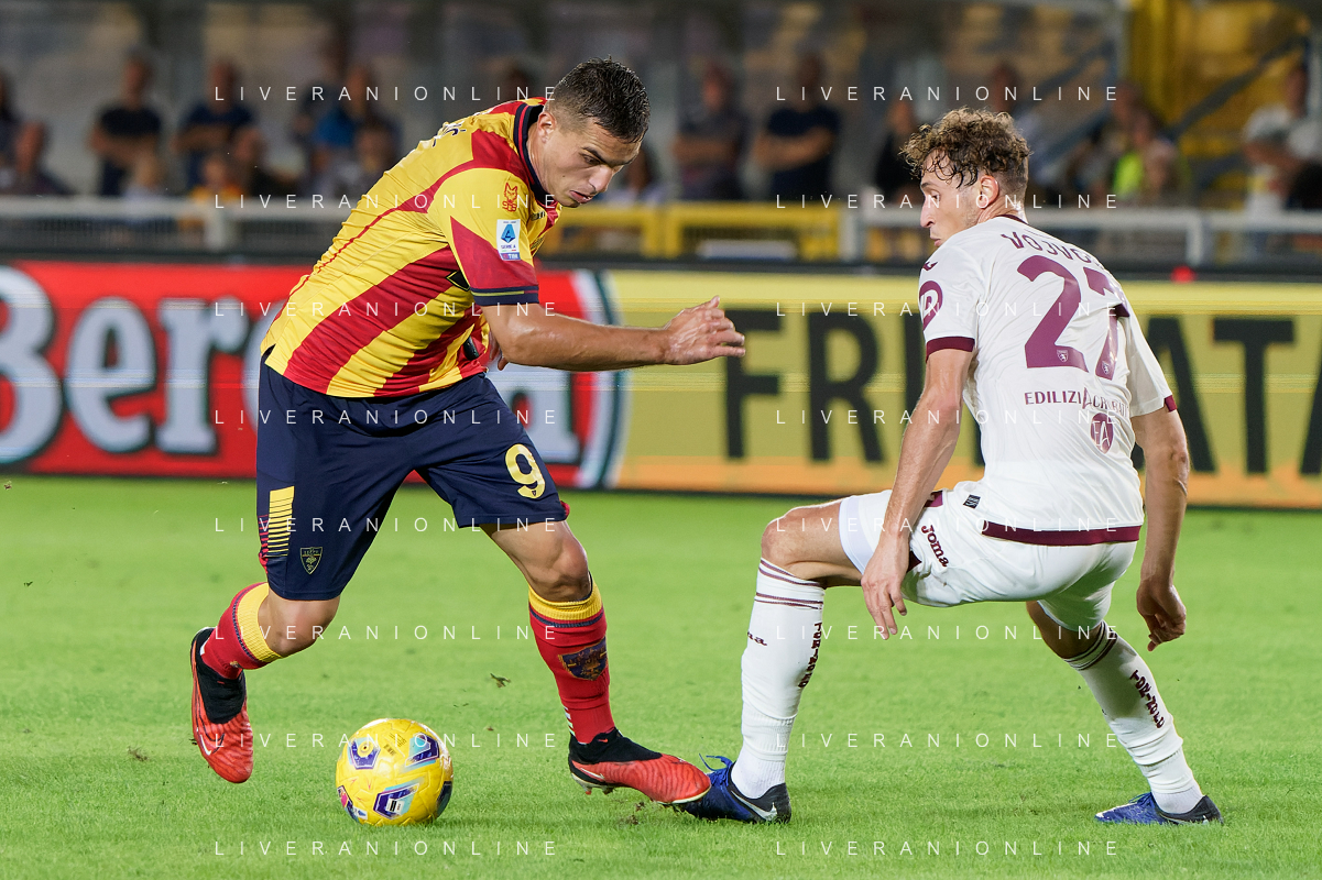 Nikola Krstovic of US Lecce and Mergim Vojvoda of Torino FC during the Italian soccer Serie A match US Lecce vs Torino FC on October 28, 2023 at Via del Mare Stadium in Lecce, Italy. Photo by Emmanuele Mastrodonato/ag. Aldo Liverani sas