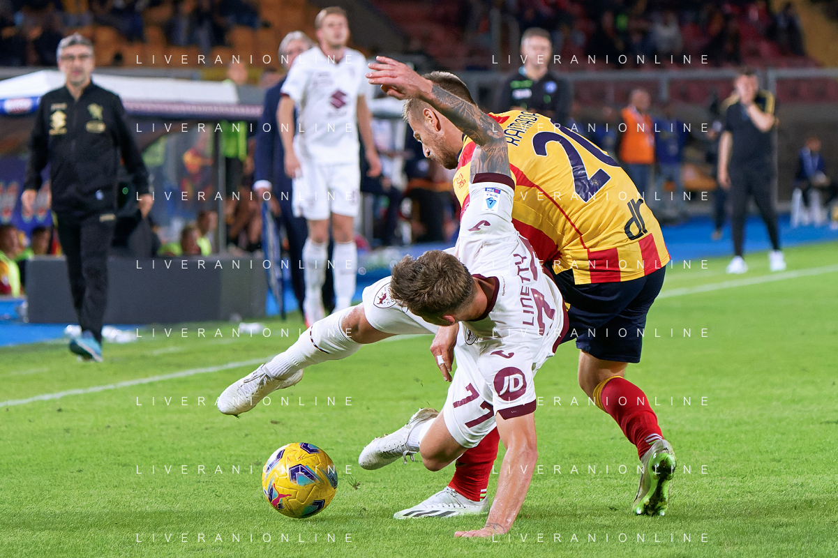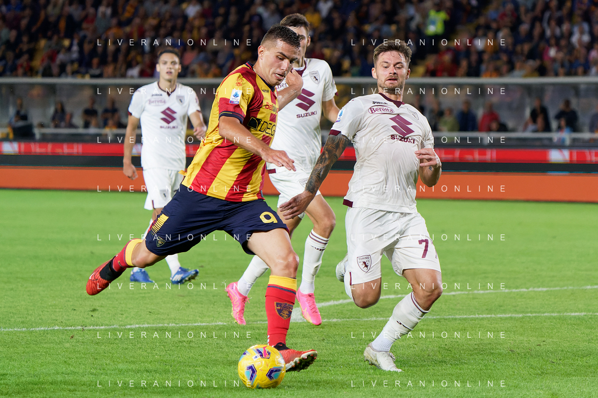 Karol Linetty of Torino FC and Ylber Ramadani of US Lecce during the Italian soccer Serie A match US Lecce vs Torino FC on October 28, 2023 at Via del Mare Stadium in Lecce, Italy. Photo by Emmanuele Mastrodonato/ag. Aldo Liverani sas