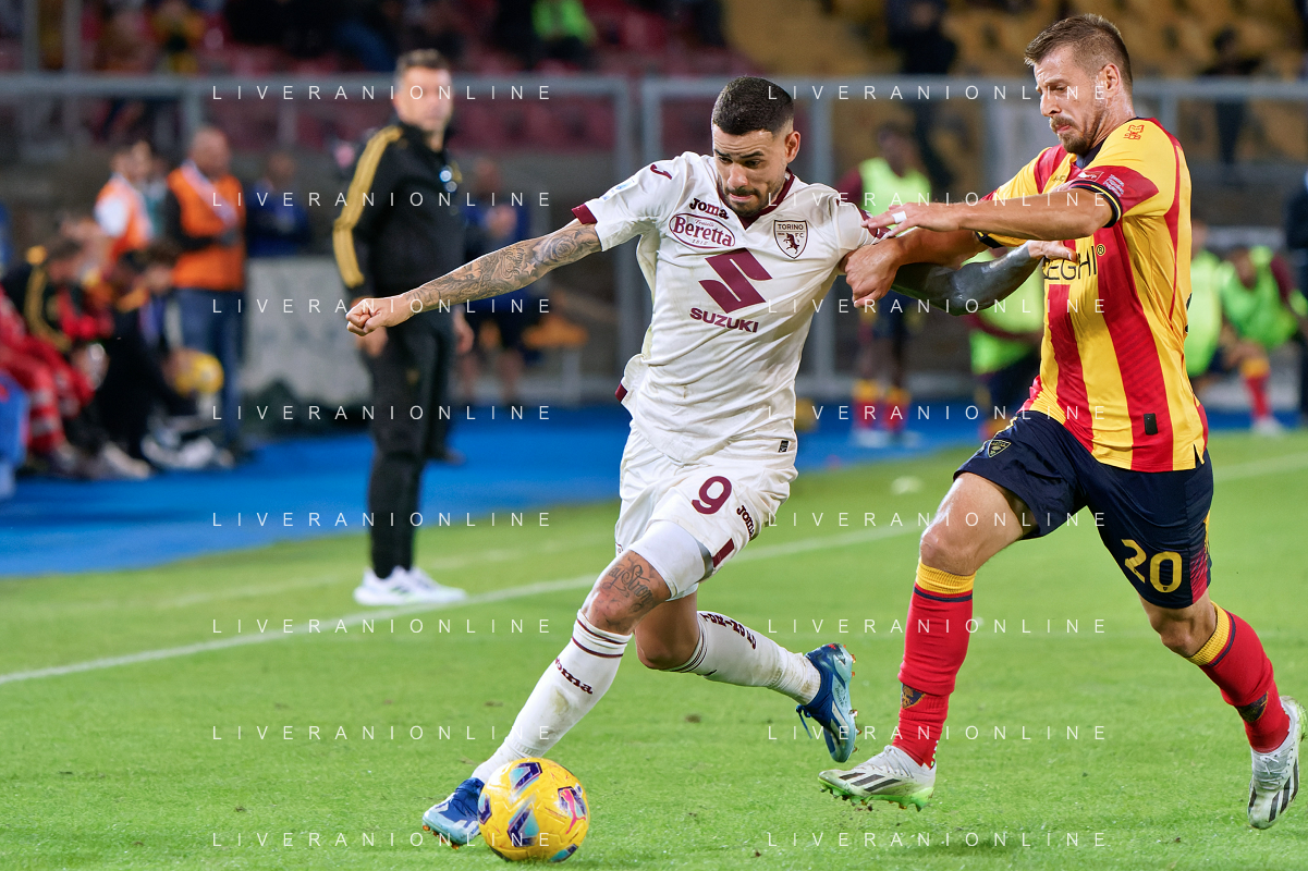Duvan Zapata of Torino FC and Nicola Sansone of US Lecce during the Italian soccer Serie A match US Lecce vs Torino FC on October 28, 2023 at Via del Mare Stadium in Lecce, Italy. Photo by Emmanuele Mastrodonato/ag. Aldo Liverani sas