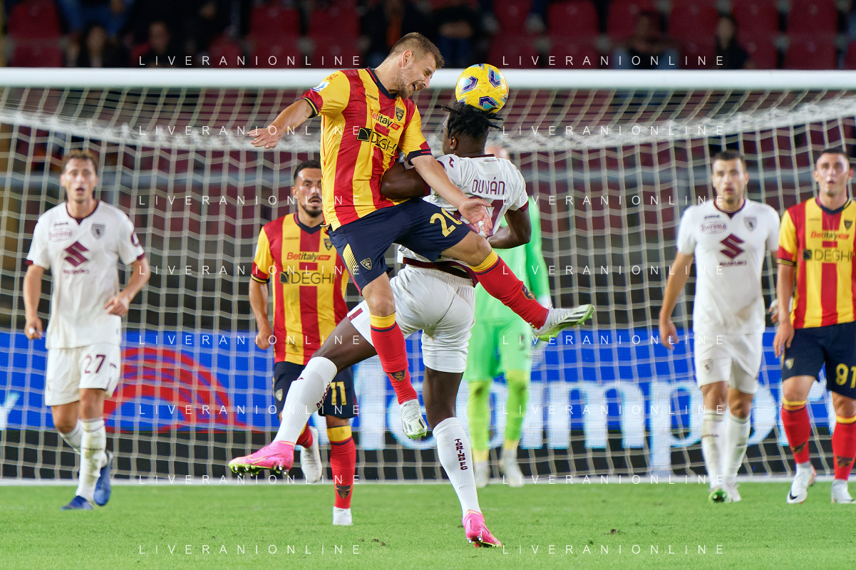 Seria A 2023-2024 Stadio Via del Mare - Lecce 28 Ottobre 2023 Nella foto: Gvidas Gineitis anticipa di testa Y. Ramadani foto andrea rosito-ag aldo liverani sas