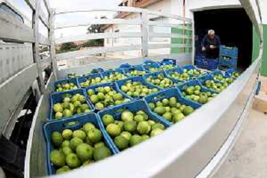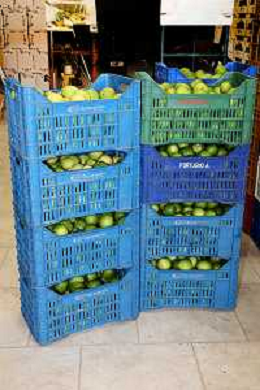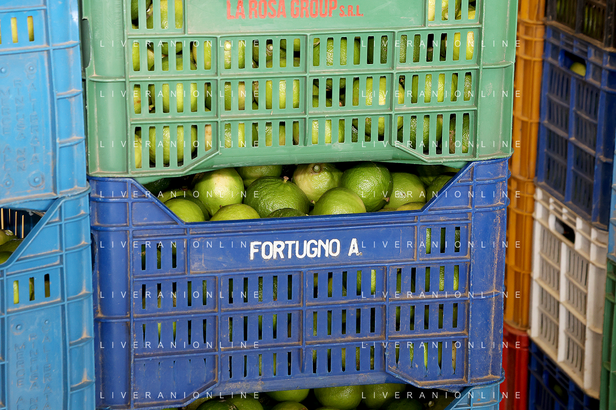Reggio Calabria 01/11/2023 Località Aretina. Azienda Agricola Bergamotto Fortugno. In foto: dopo accurata selezione le cassette di bergamotto vengono impilate sulle pedane FOTO PASQUALE GAREFFA-AG ALDO LIVERANI SAS