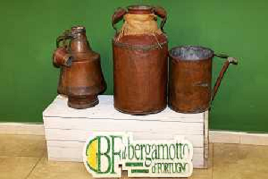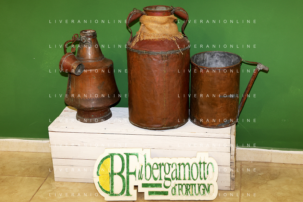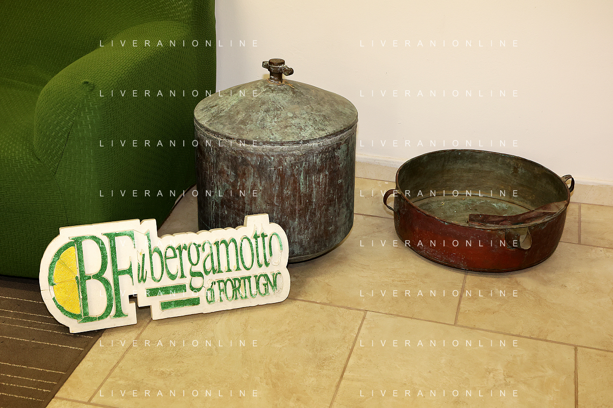 Reggio Calabria 01/11/2023 Località Aretina. Azienda Agricola Bergamotto Fortugno. In foto: contenitori in rame che si usavano nel 1900 per lavorare l'essenza del bergamotto FOTO PASQUALE GAREFFA-AG ALDO LIVERANI SAS