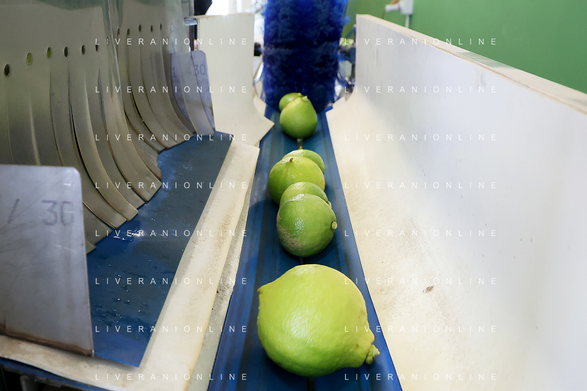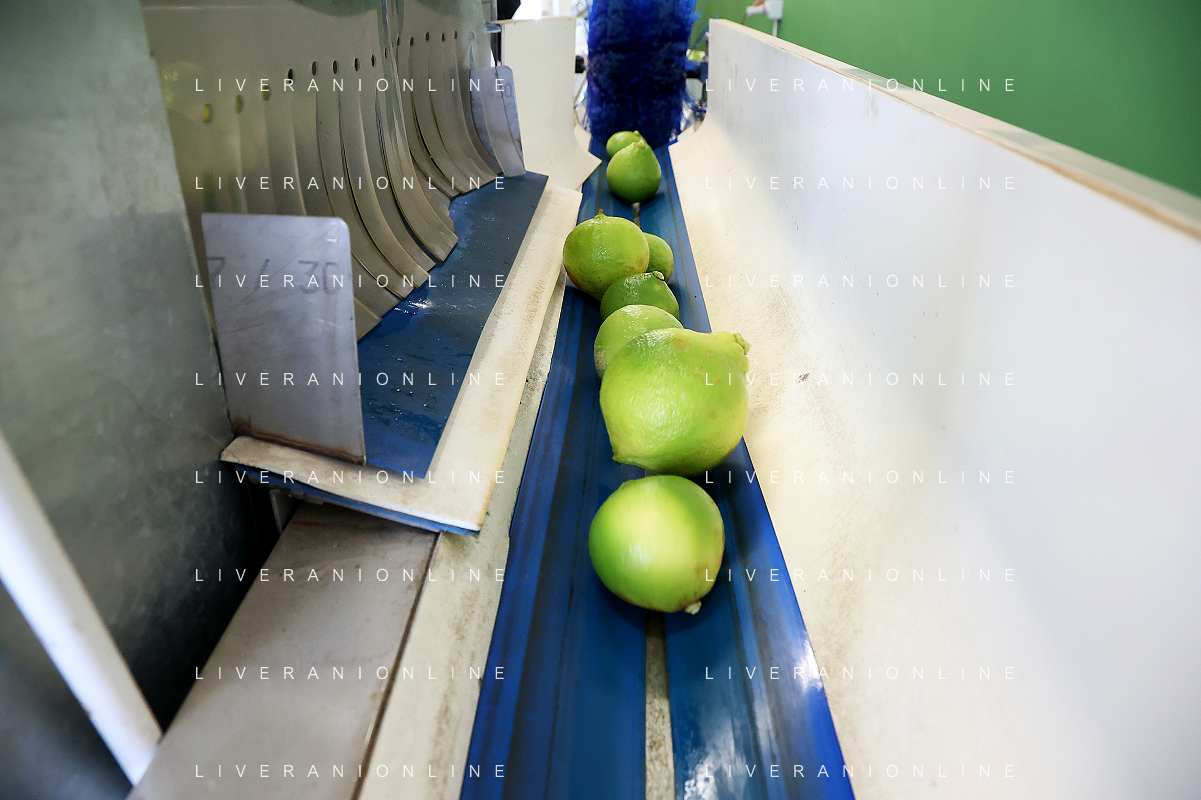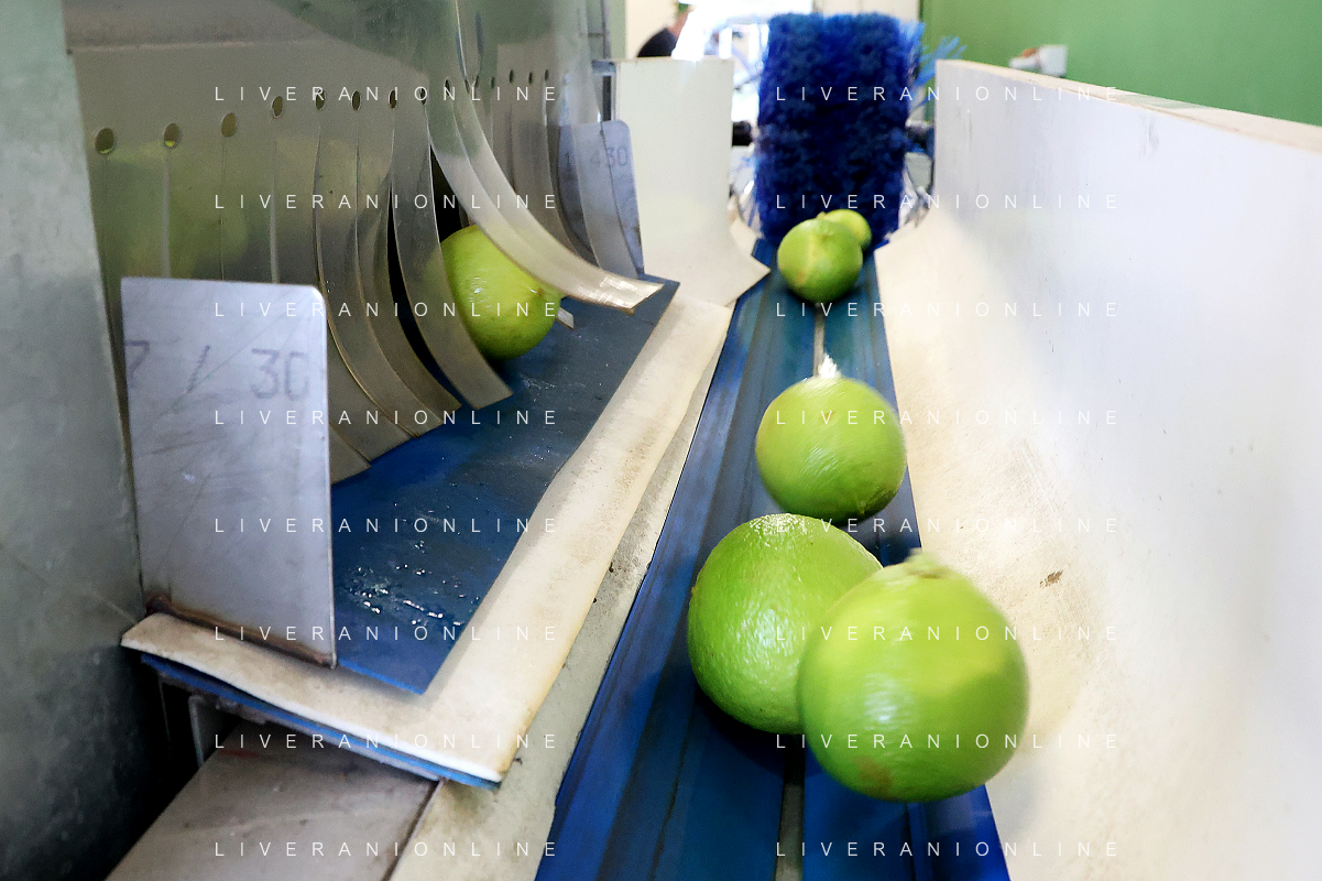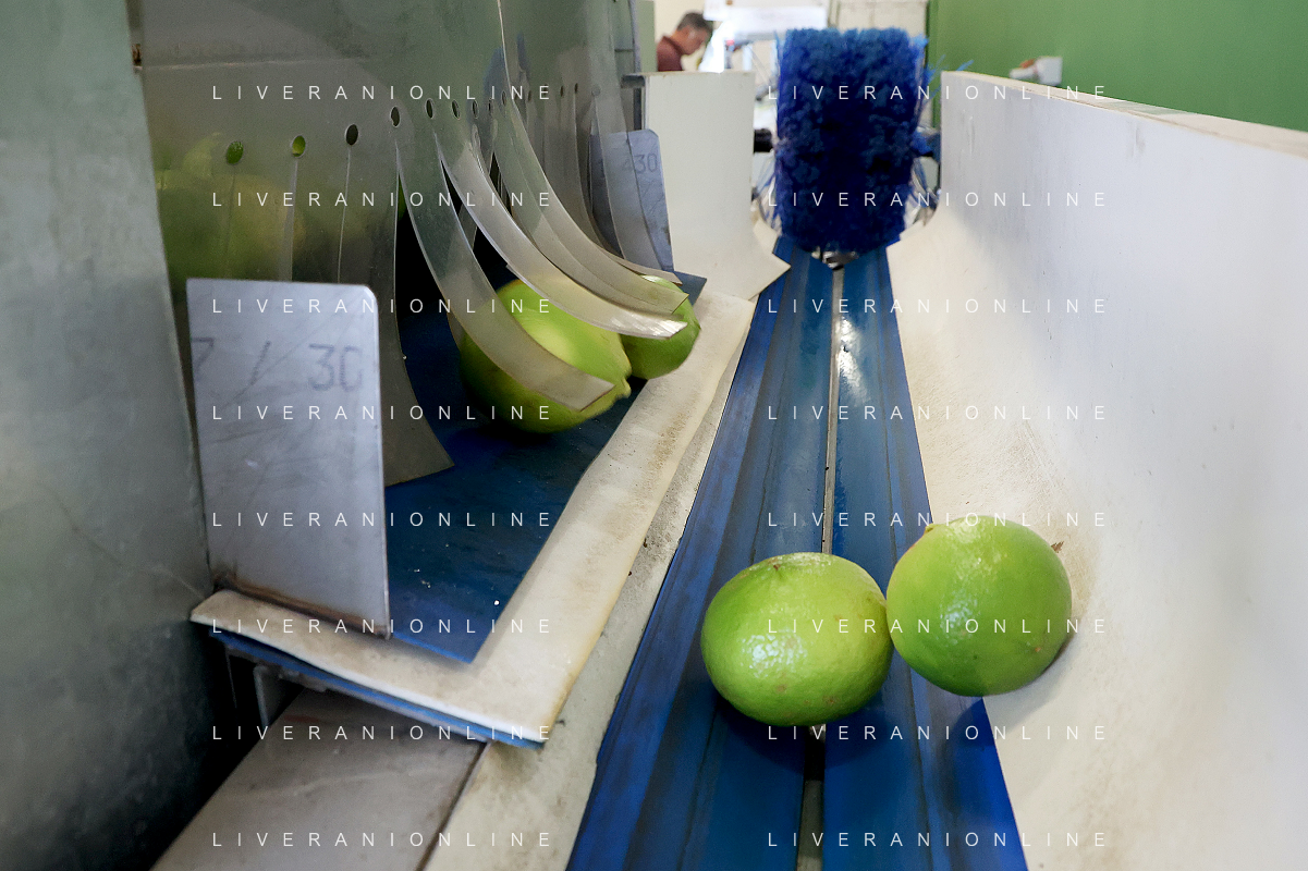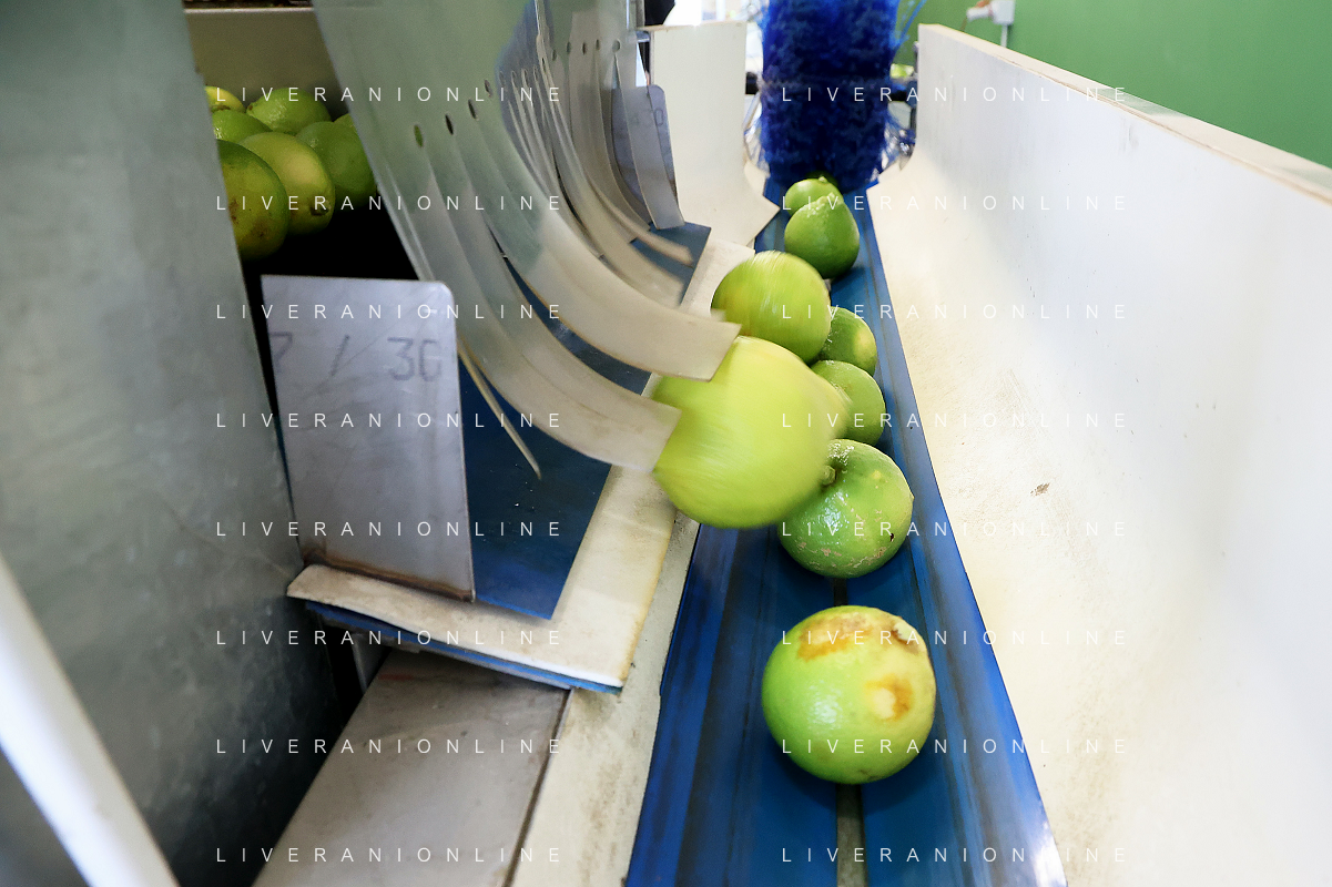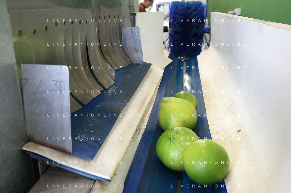 Reggio Calabria 01/11/2023 Località Aretina. Azienda Agricola Bergamotto Fortugno. In foto: il Bergamotto dopo essere stato lavato e asciugato, viene trasportato dal nastro e diviso nei contenitori per peso FOTO PASQUALE GAREFFA-AG ALDO LIVERANI SAS