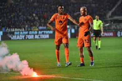 Atalanta vs Inter nella foto tifosi Inter lanciano fumogeni in campo - denzel dumfries e federico dimarco Bergamo 04-11-2023 Gewiss Stadium - Stadio Atleti Azzurri d'Italia Campionato Serie A TIM - 11a giornata foto Roberto Garavaglia/ag. Aldo Liverani sas/AGENZIA ALDO LIVERANI SAS