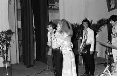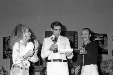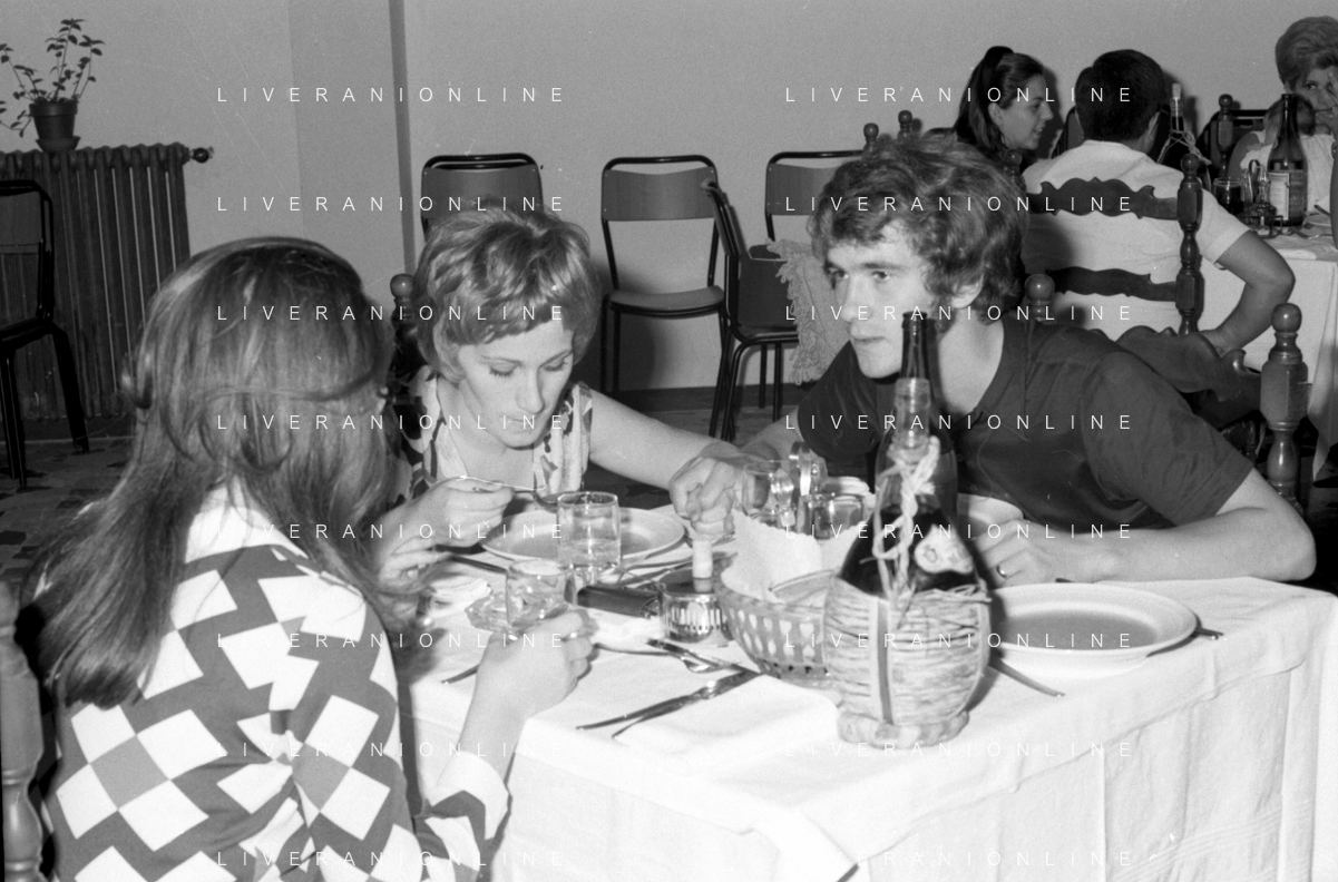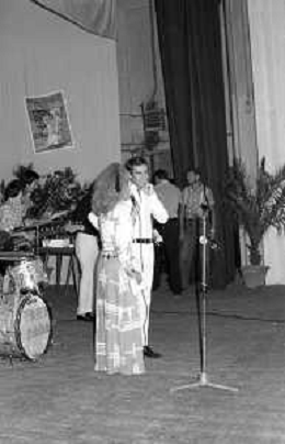 Neg- RETROSPETTIVA 1° PREMIO FERRAGOSTO D'ORO RICCIONE 18 AGOSTO 1969 NELLA FOTO IL GRUPPO MUSICALE 'ANONIMA SOUND' COMPOSTO DA IVAN GRAZIANI (chitarra-voce con la moglie Anna Bischi), WALTER MONACCHI (basso) e VELIO GUALAZZI (batteria) CON IL CANTANTE ROSSANO ATTOLICO AG ALDO LIVERANI SAS