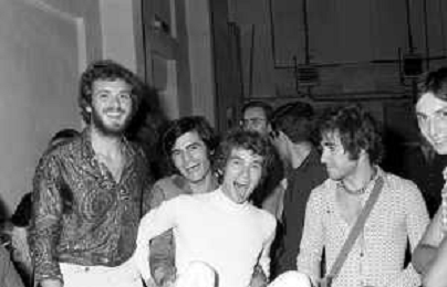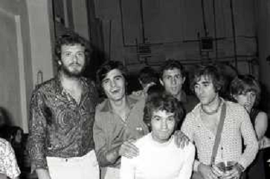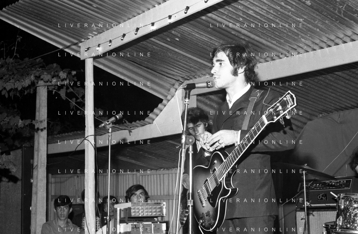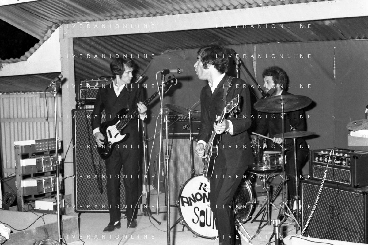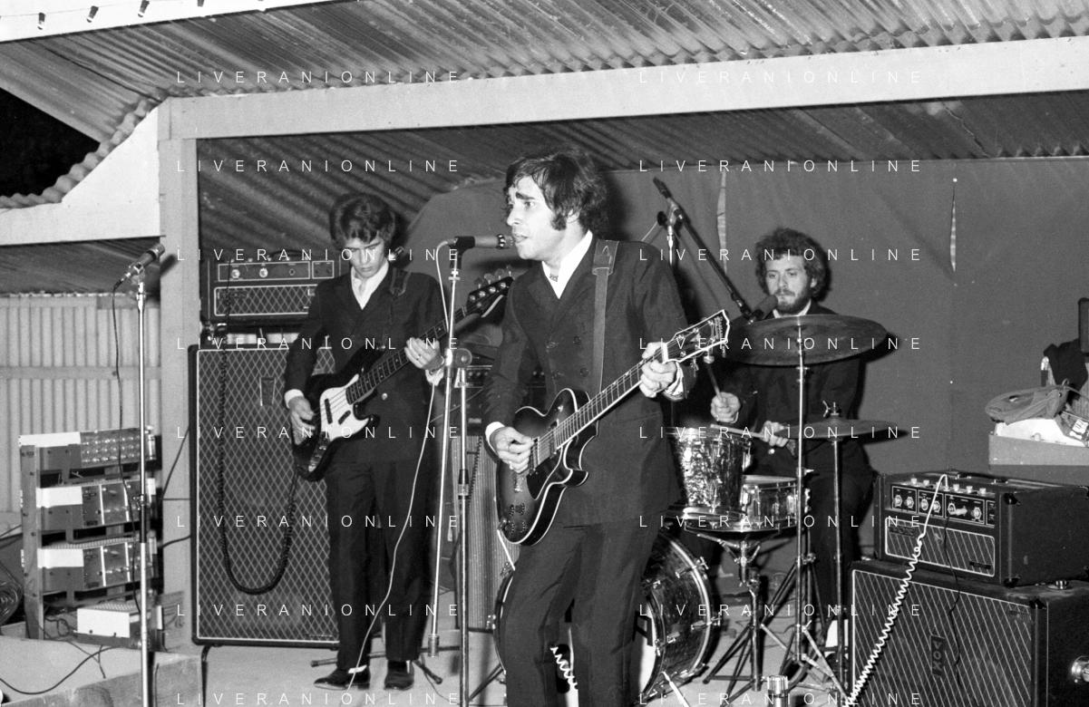 Neg- RETROSPETTIVA 1° PREMIO FERRAGOSTO D'ORO RICCIONE 18 AGOSTO 1969 NELLA FOTO IL GRUPPO MUSICALE 'ANONIMA SOUND' COMPOSTO DA IVAN GRAZIANI (chitarra-voce), WALTER MONACCHI (basso) e VELIO GUALAZZI (batteria) CON IL CANTANTE ROSSANO ATTOLICO AG ALDO LIVERANI SAS