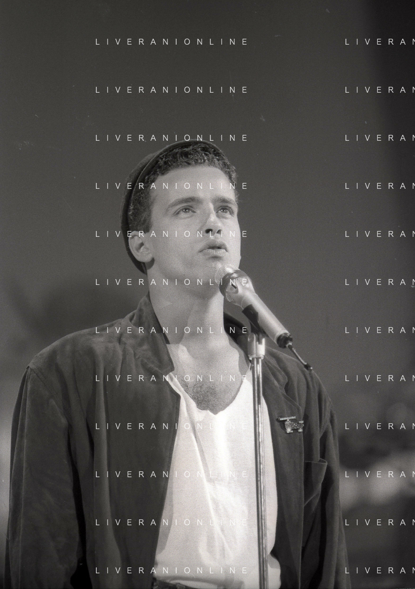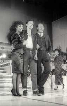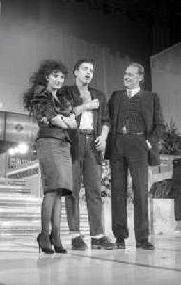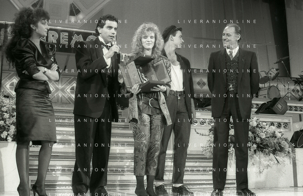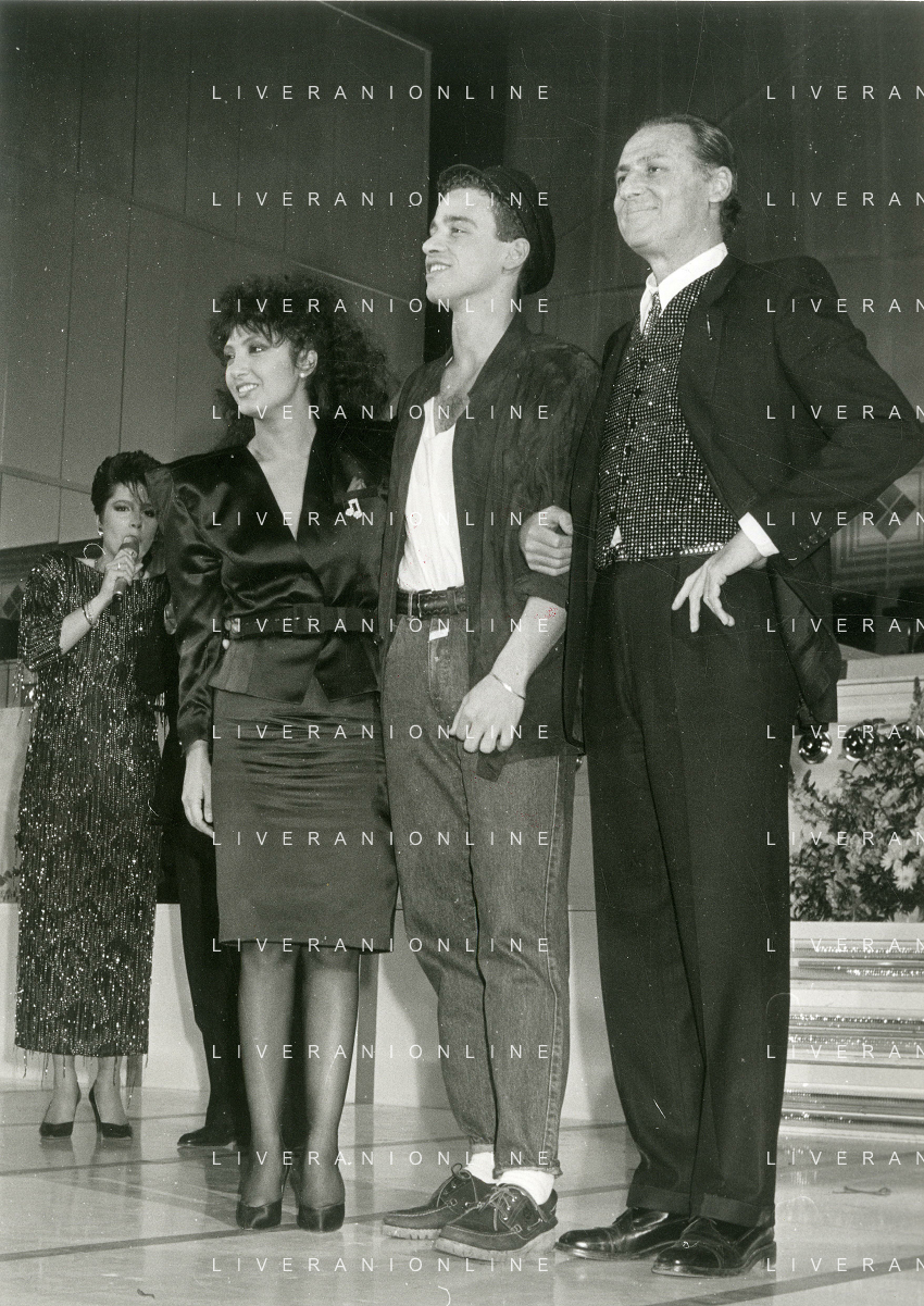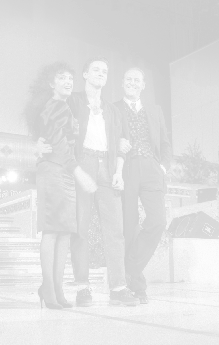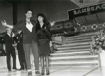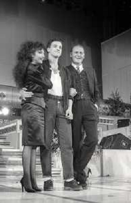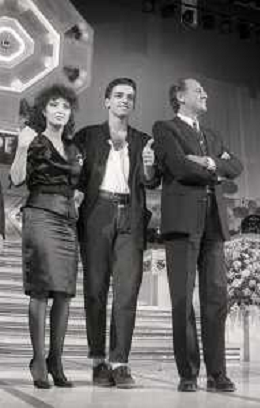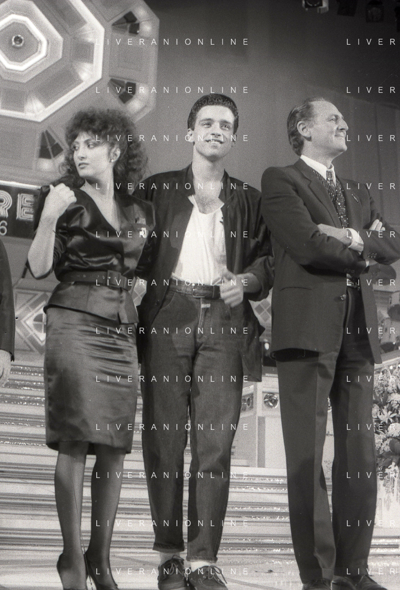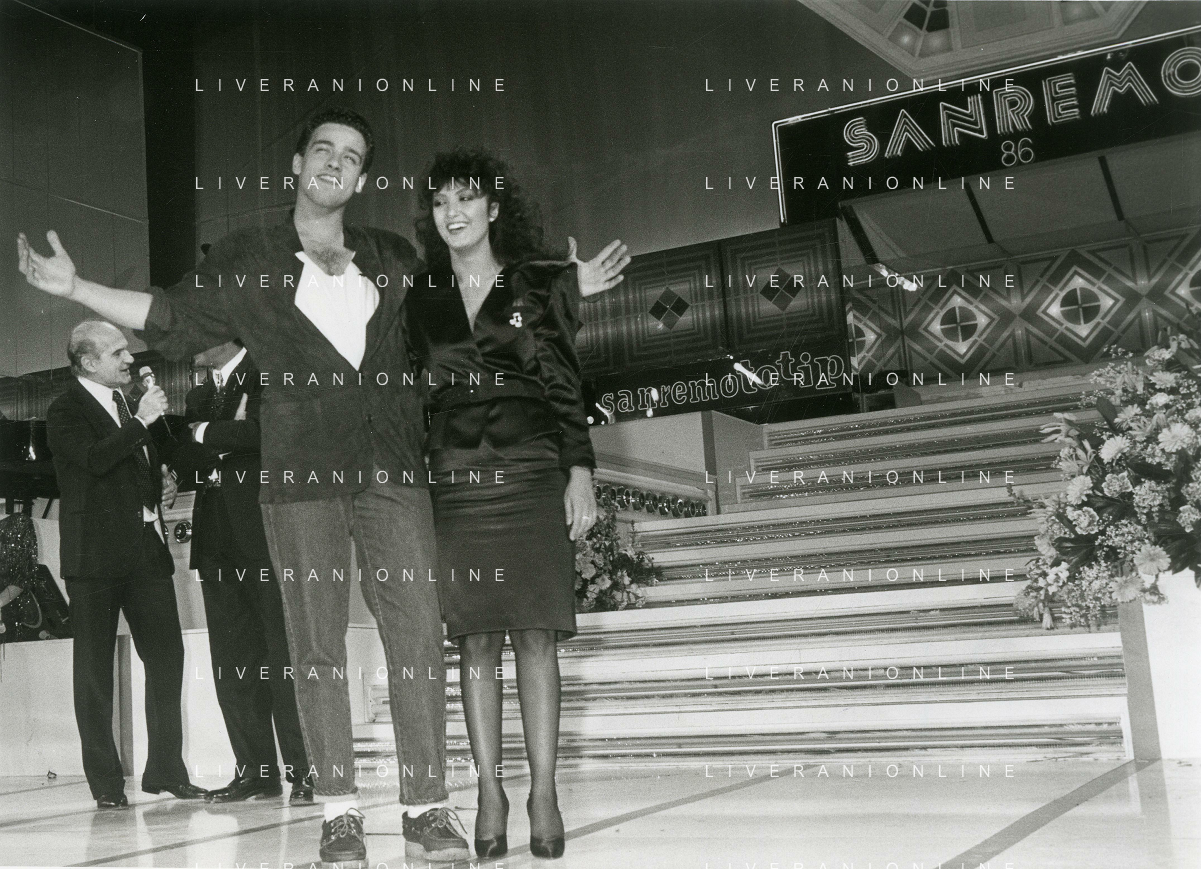 NEG-RETROSPETTIVA EROS RAMAZZOTTI CANTANTE NELLA FOTO EROS RAMAZZOTTI NELL'ANNO 1986 AL FESTIVAL DI SANREMO CON RENZO ARBORE E MARCELLA BELLA AG ALDO LIVERANI SAS