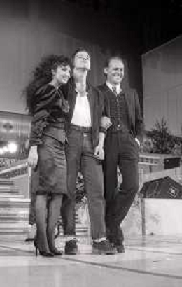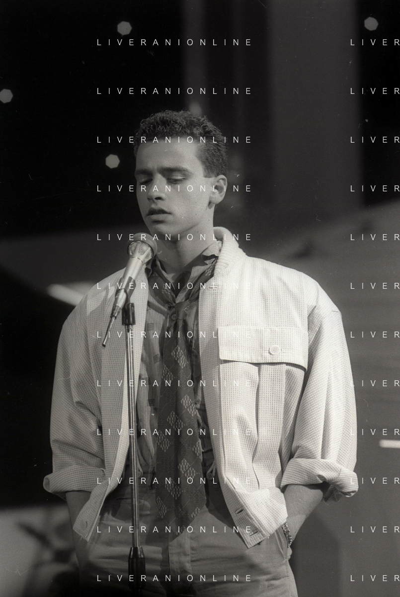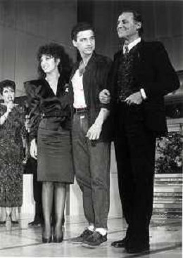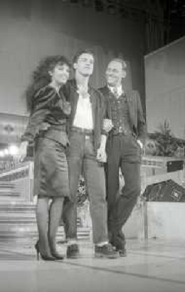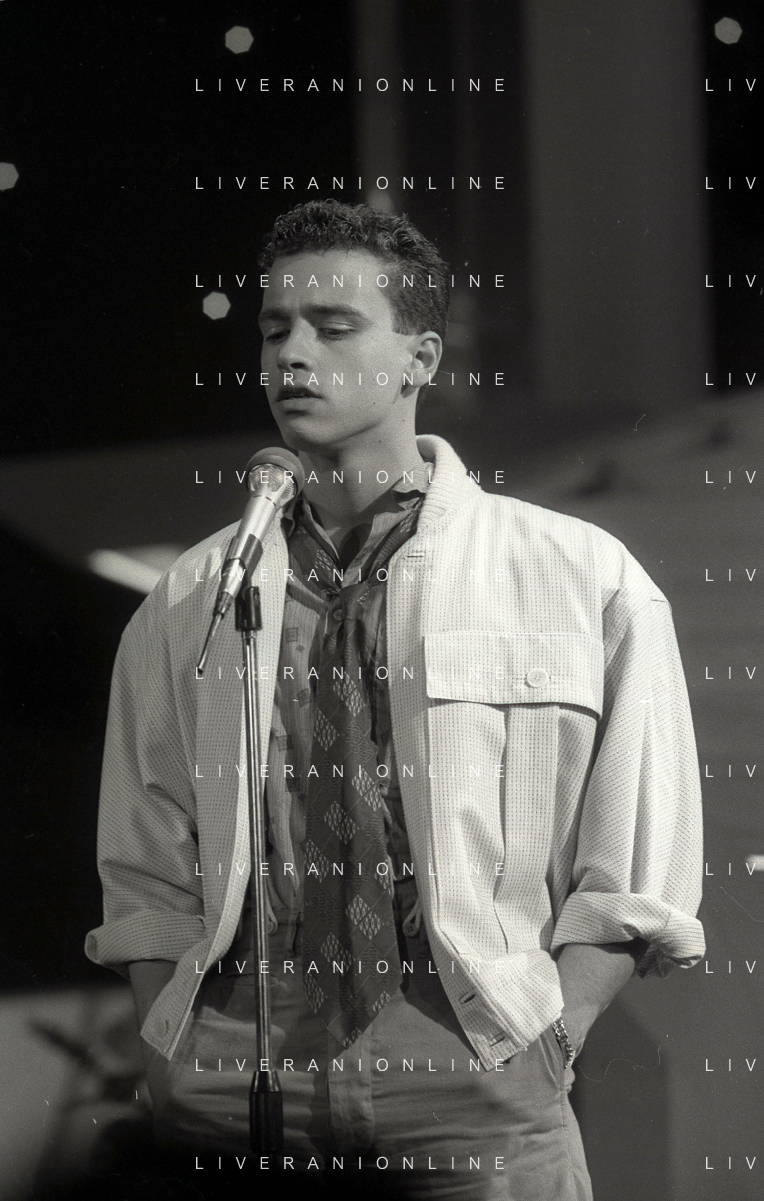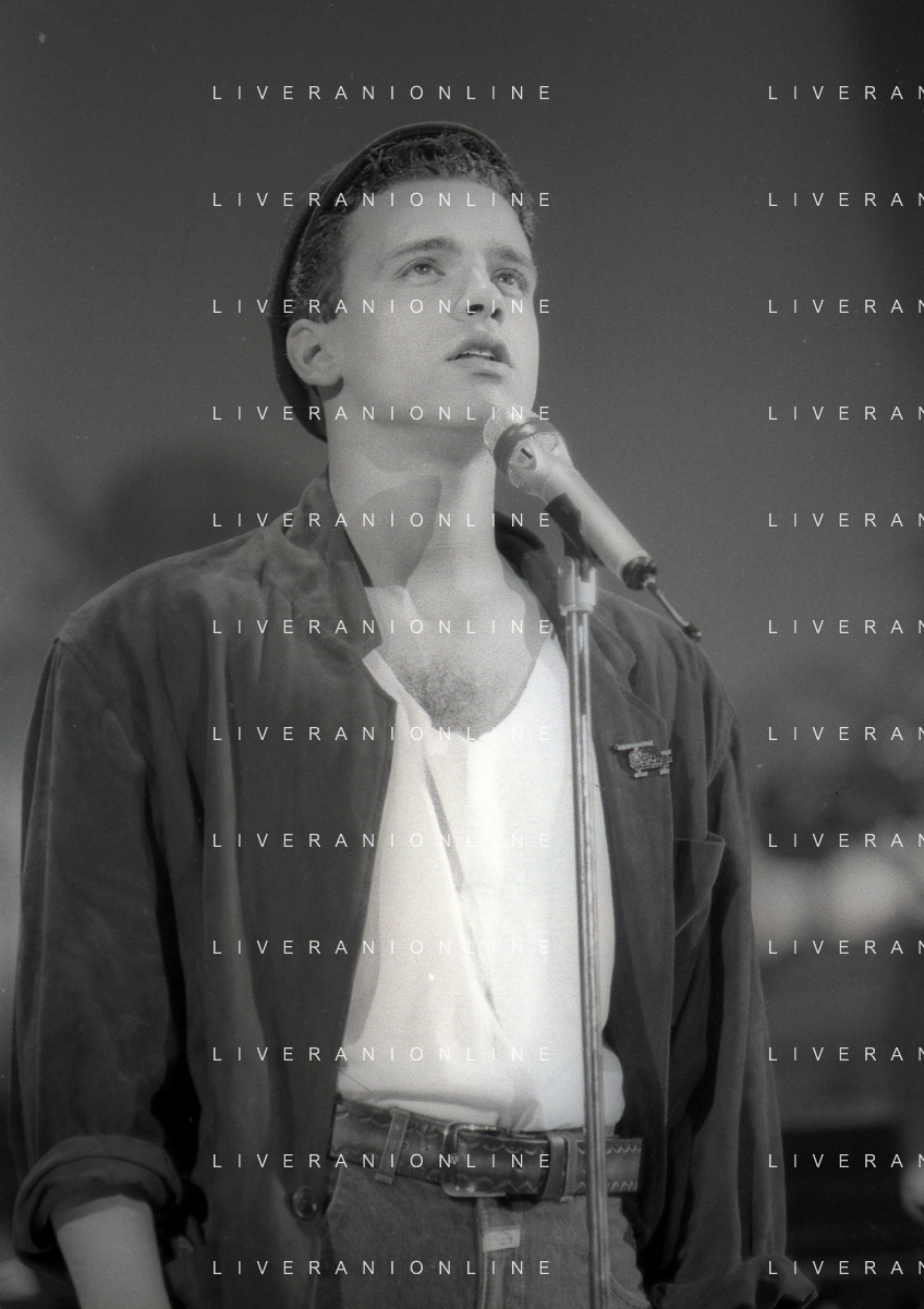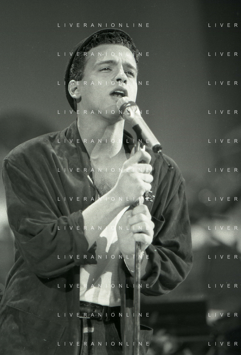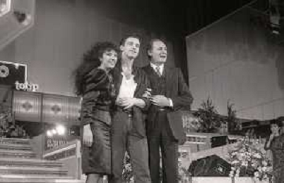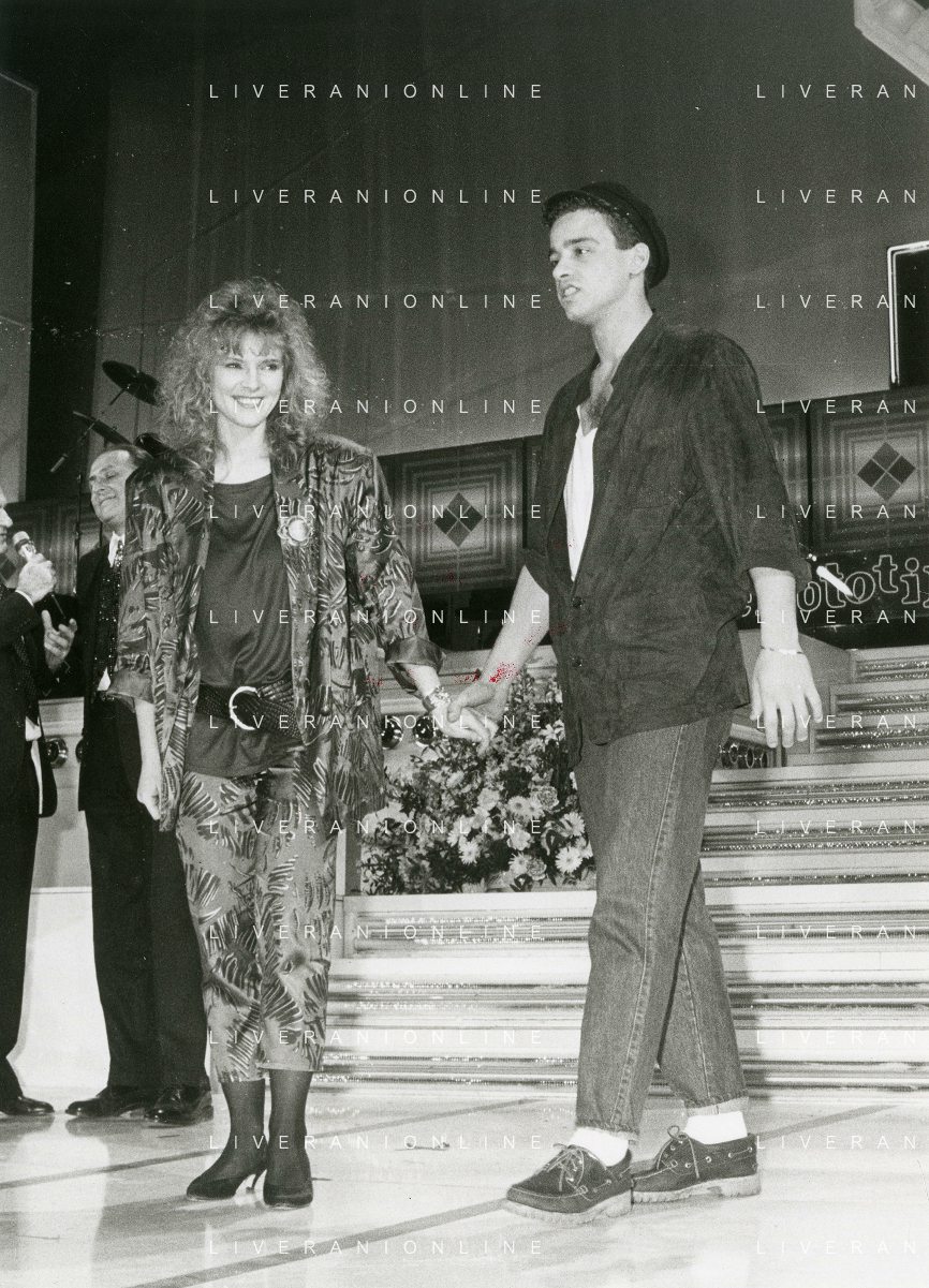 NEG-RETROSPETTIVA EROS RAMAZZOTTI CANTANTE NELLA FOTO EROS RAMAZZOTTI NELL'ANNO 1986 AL FESTIVAL DI SANREMO CON RENZO ARBORE E MARCELLA BELLA AG ALDO LIVERANI SAS
