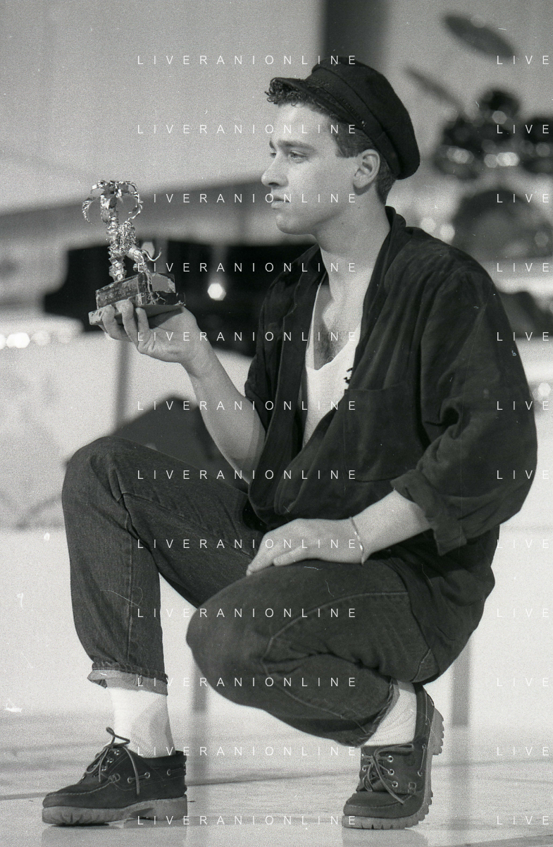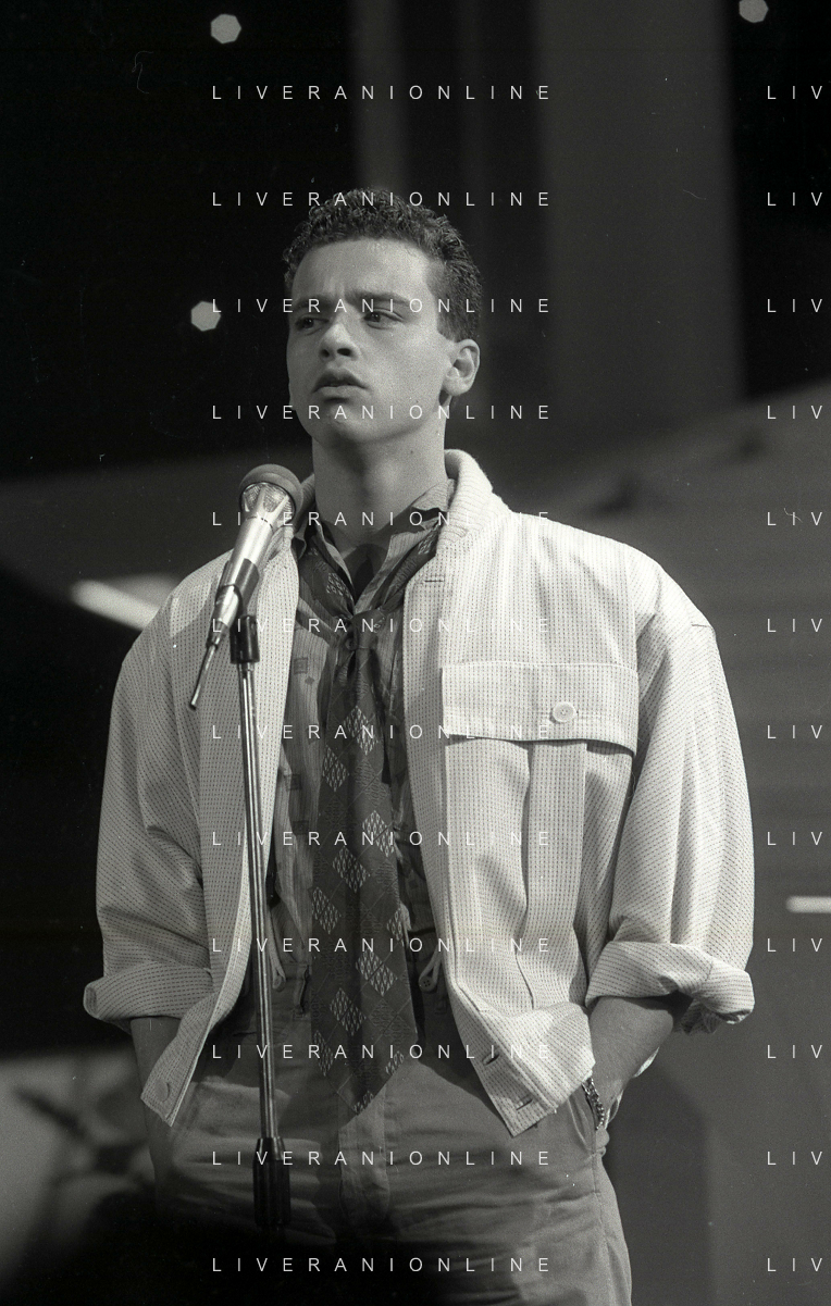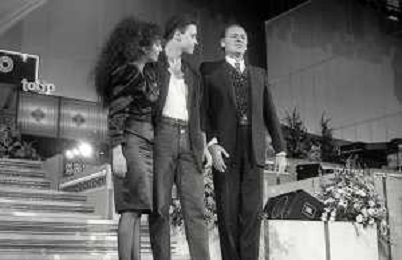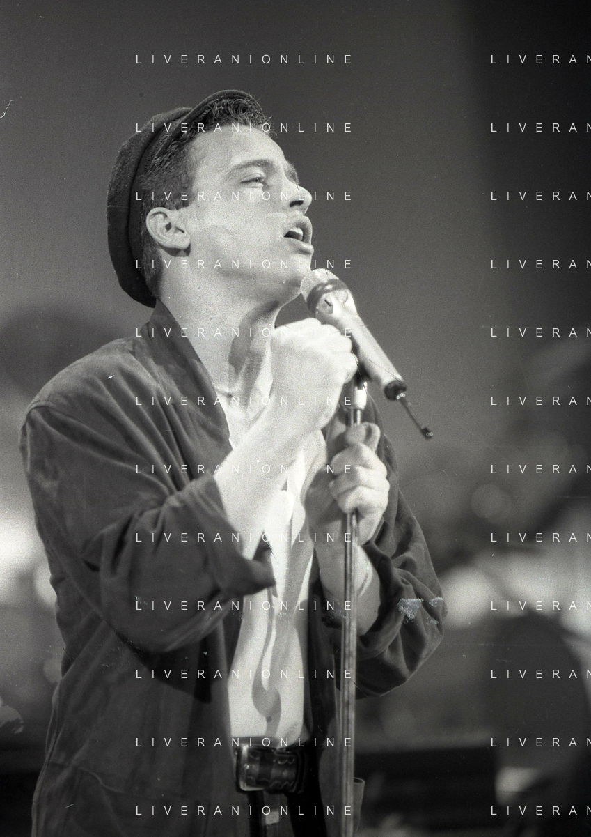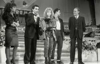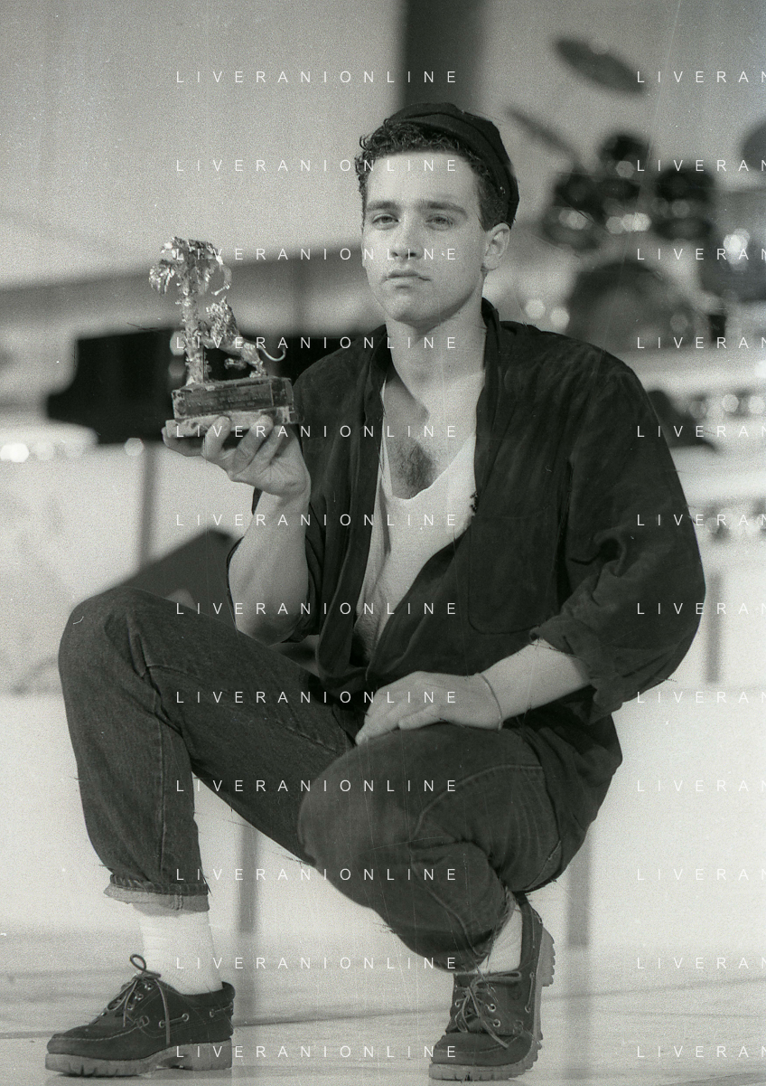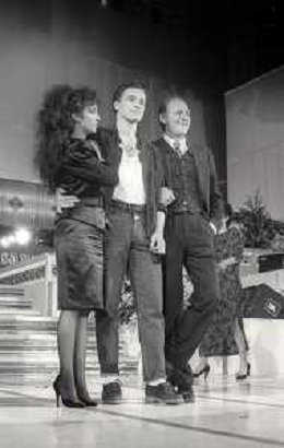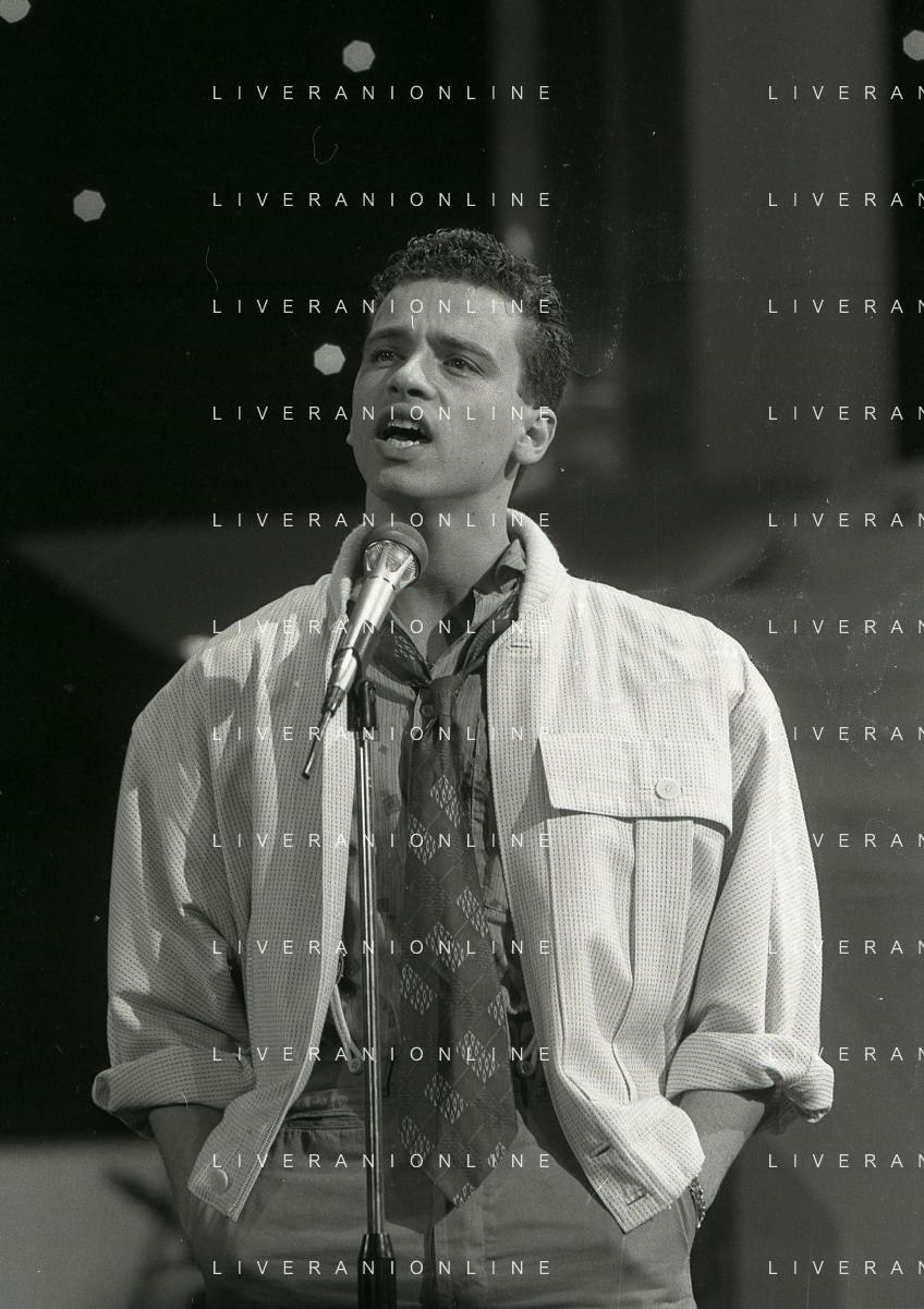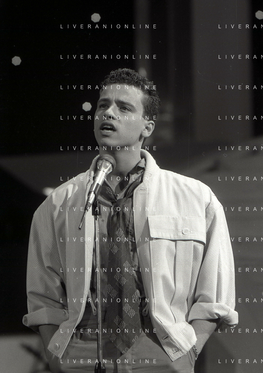 NEG-RETROSPETTIVA EROS RAMAZZOTTI CANTANTE NELLA FOTO EROS RAMAZZOTTI NELL'ANNO 1986 AL FESTIVAL DI SANREMO CON RENZO ARBORE E MARCELLA BELLA AG ALDO LIVERANI SAS