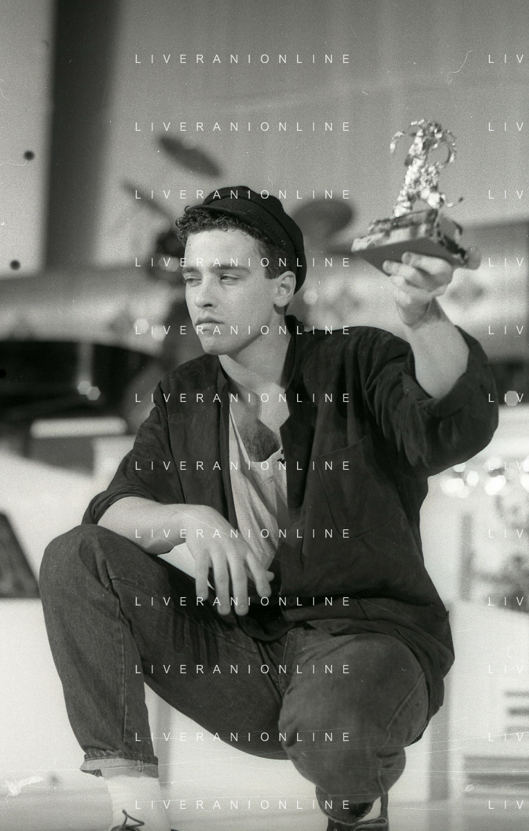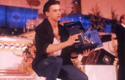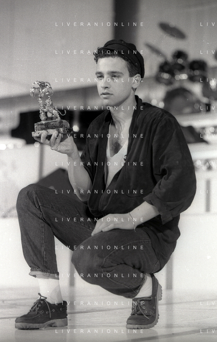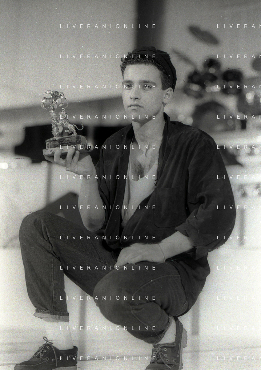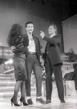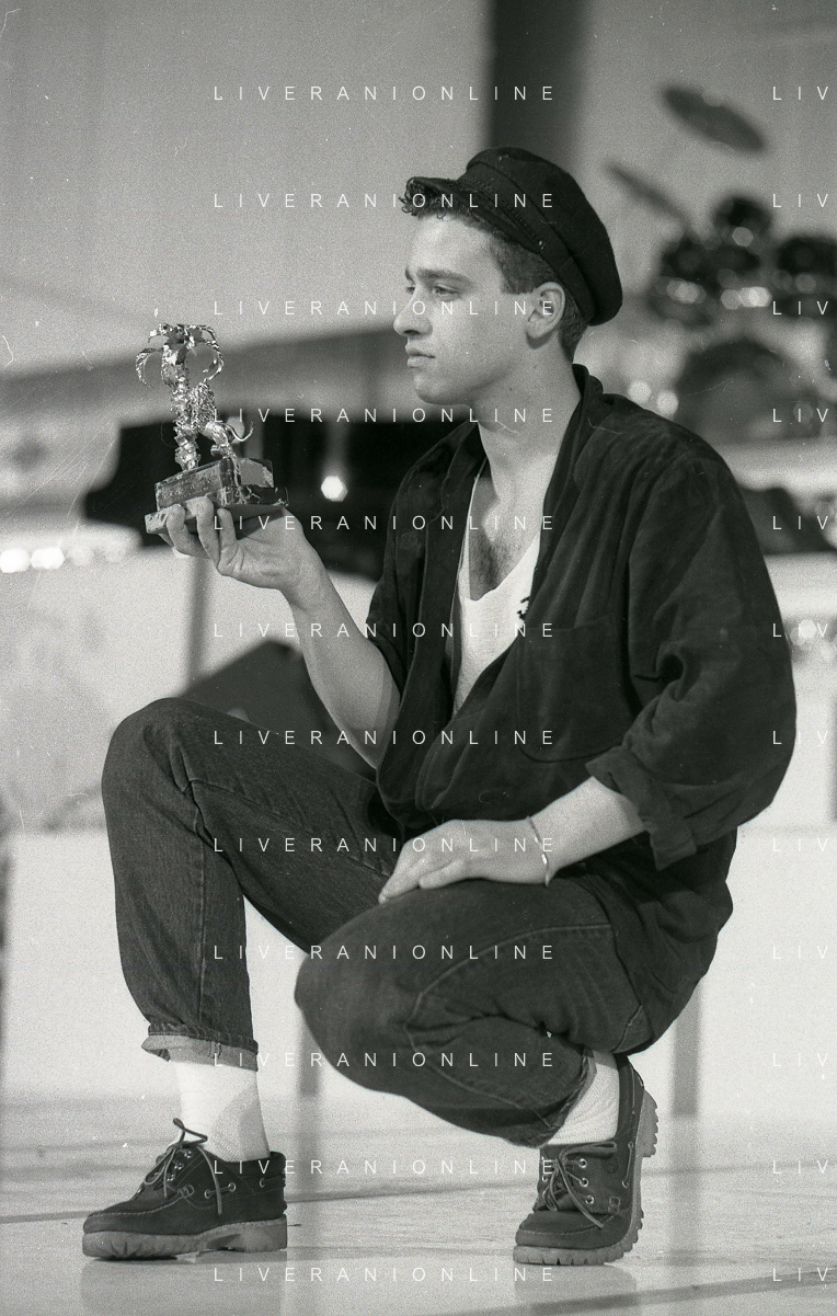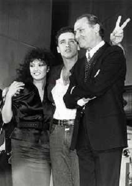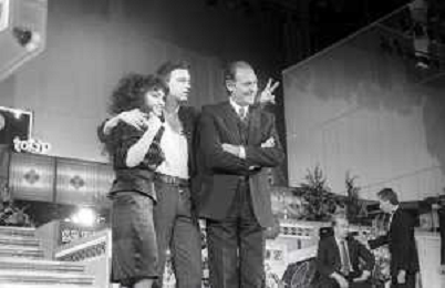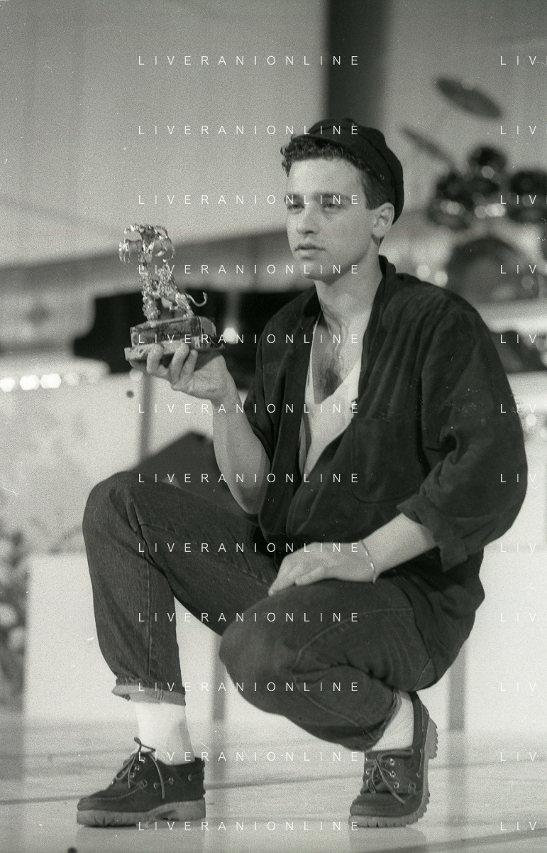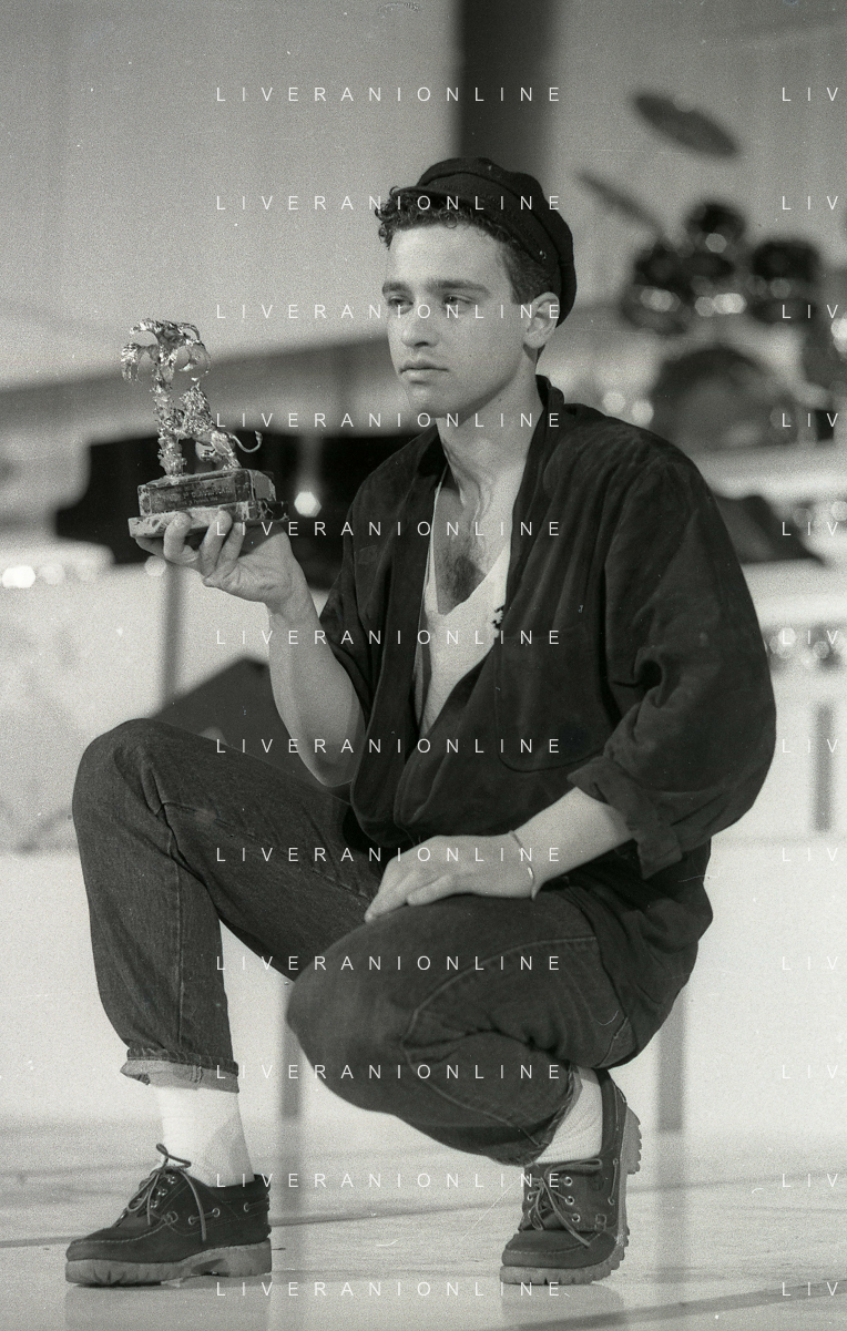 NEG-RETROSPETTIVA EROS RAMAZZOTTI CANTANTE NELLA FOTO EROS RAMAZZOTTI NELL'ANNO 1986 AL FESTIVAL DI SANREMO CON RENZO ARBORE E MARCELLA BELLA AG ALDO LIVERANI SAS