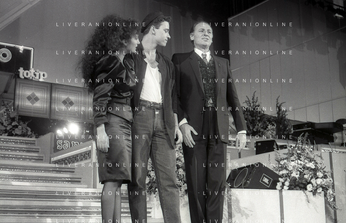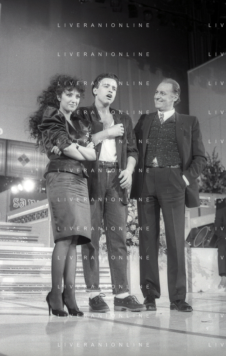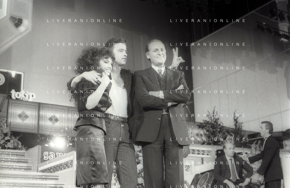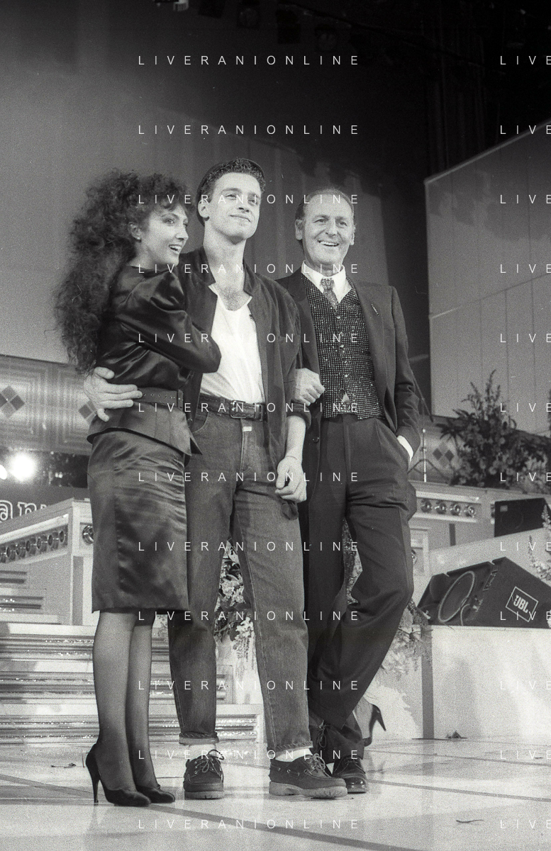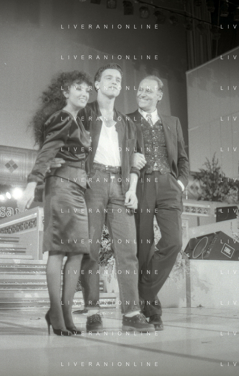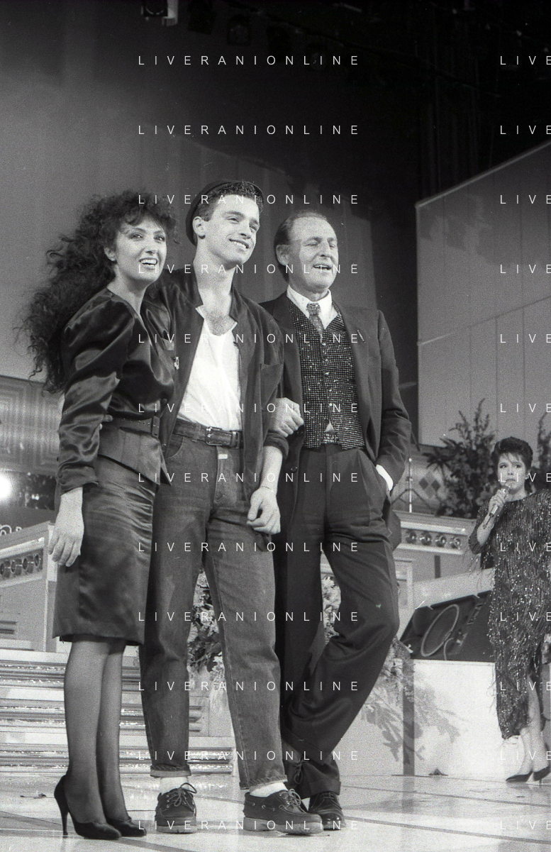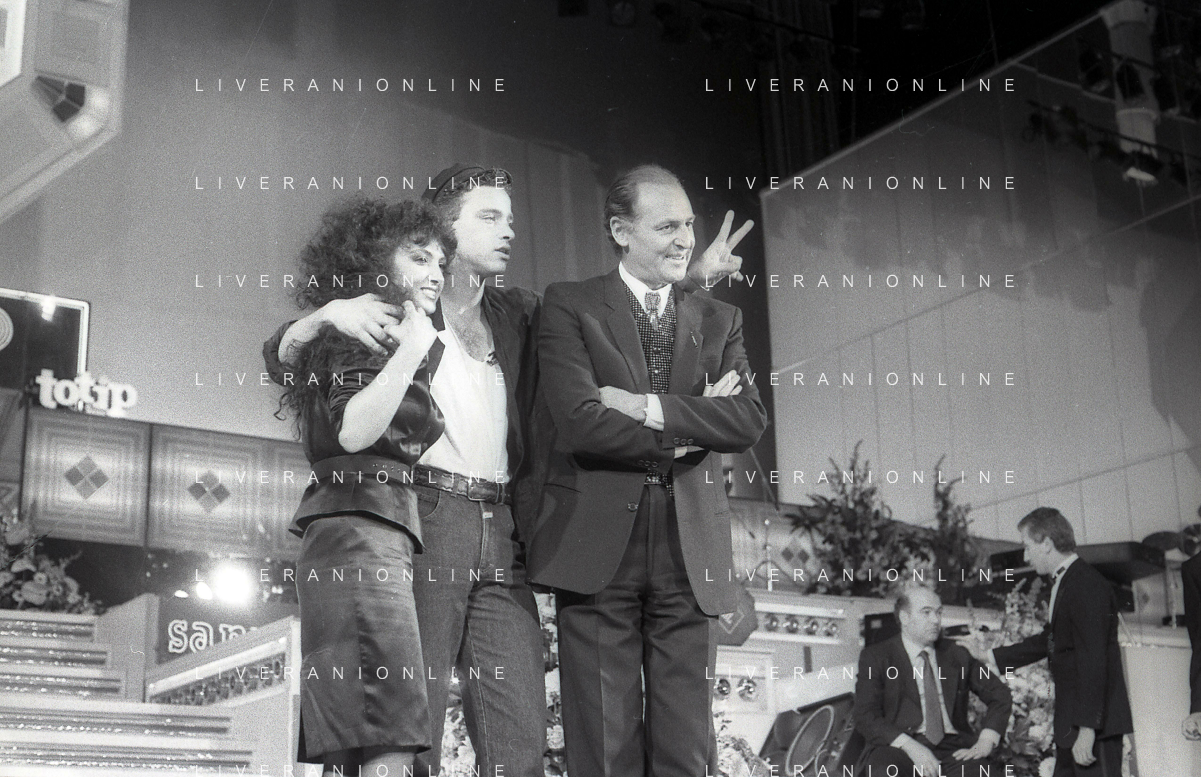 NEG-RETROSPETTIVA EROS RAMAZZOTTI CANTANTE NELLA FOTO EROS RAMAZZOTTI CON RENZO ARBORE E MARCELLA BELLA NELL'ANNO 1986 AL FESTIVAL DI SANREMO AG ALDO LIVERANI SAS