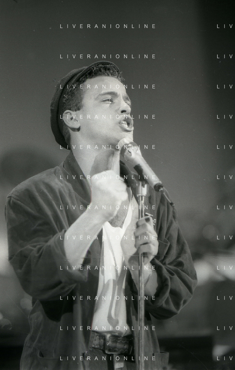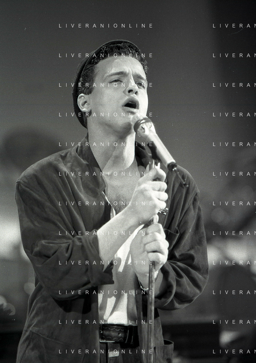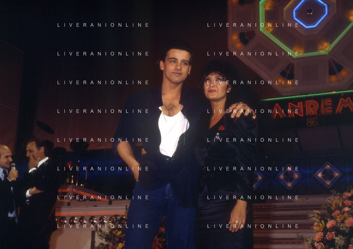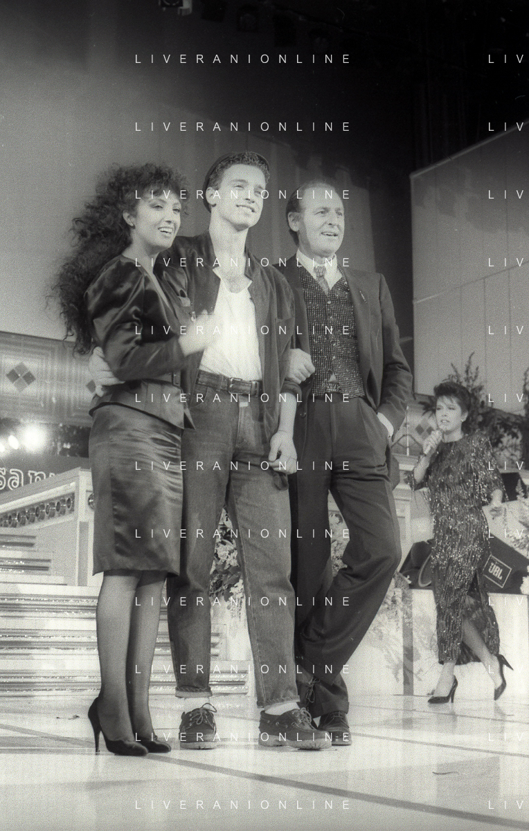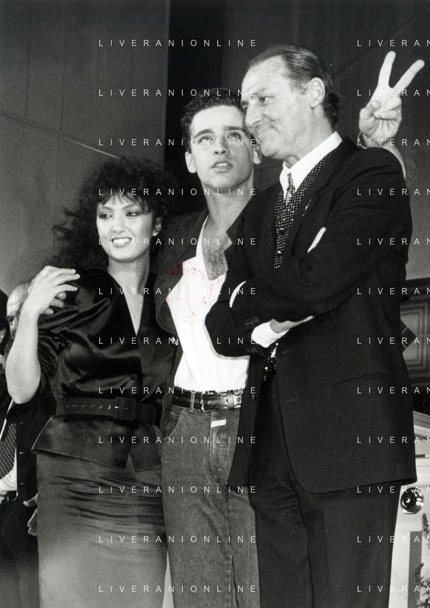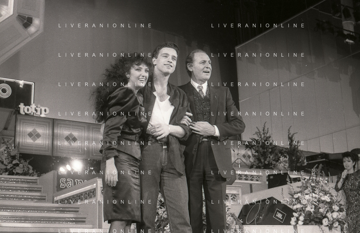 NEG-RETROSPETTIVA EROS RAMAZZOTTI CANTANTE NELLA FOTO EROS RAMAZZOTTI CON RENZO ARBORE E MARCELLA BELLA NELL'ANNO 1986 AL FESTIVAL DI SANREMO AG ALDO LIVERANI SAS