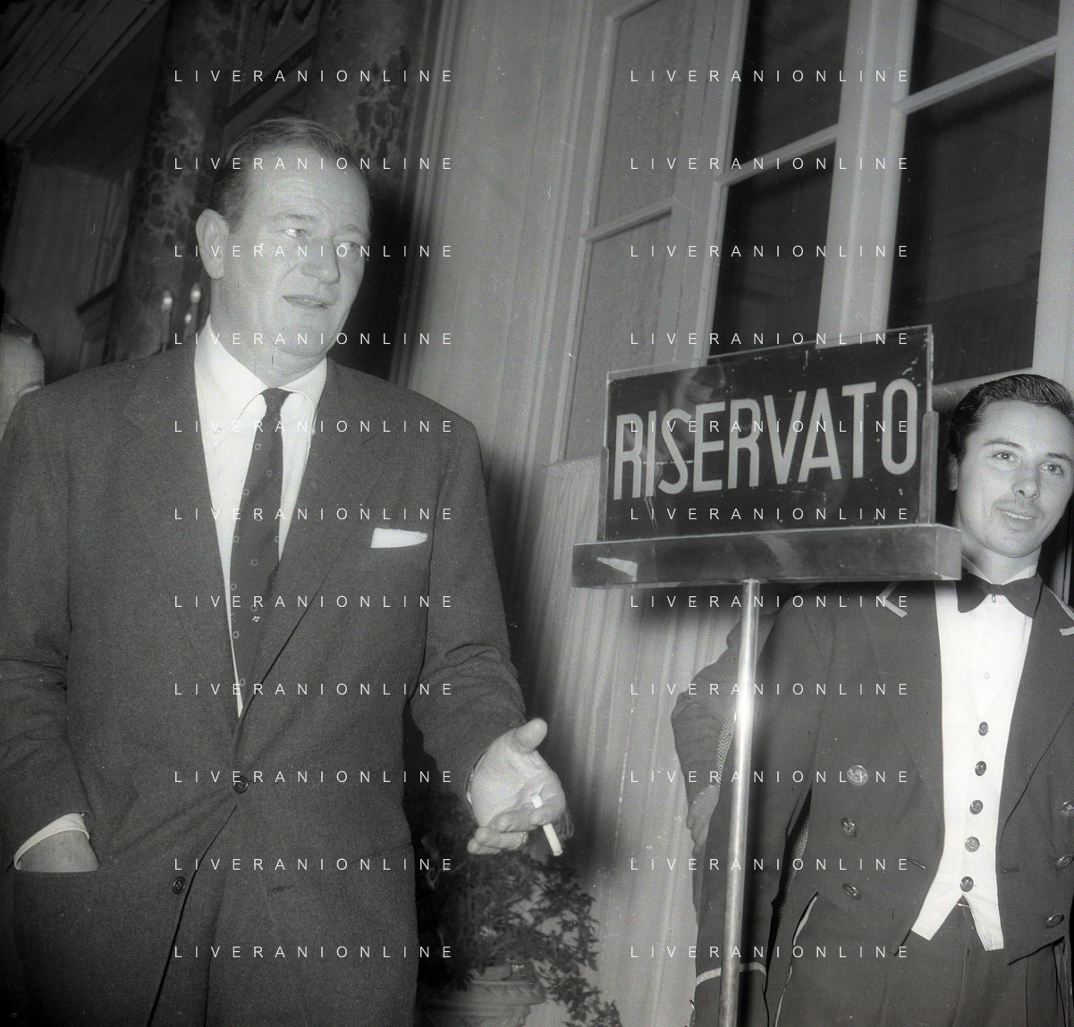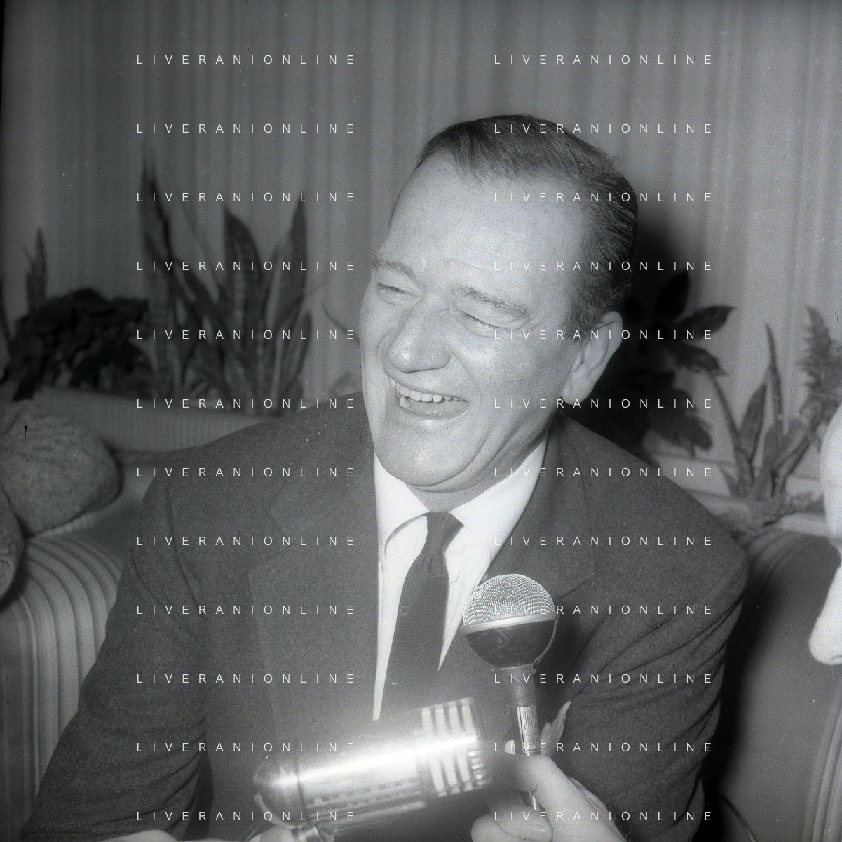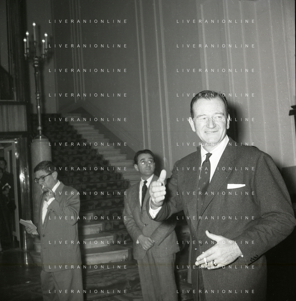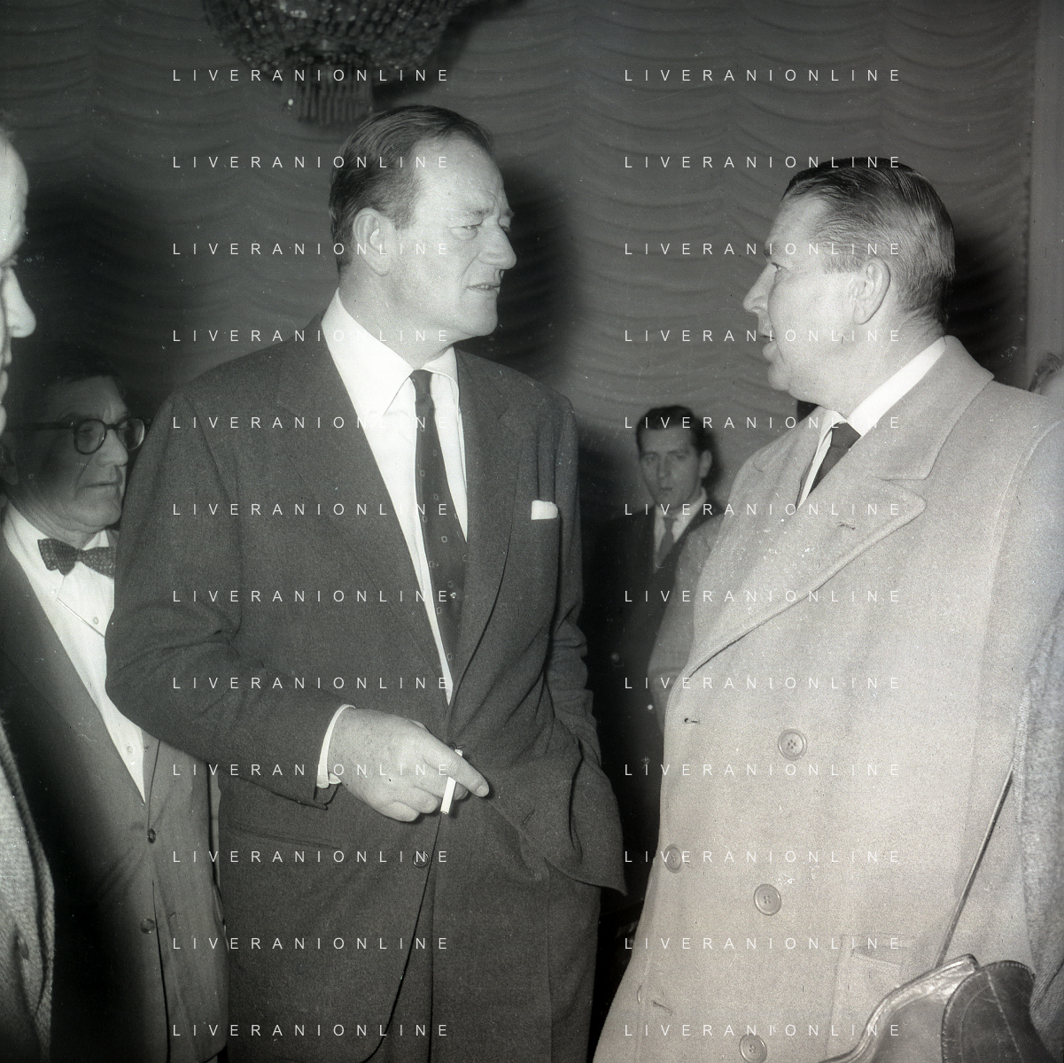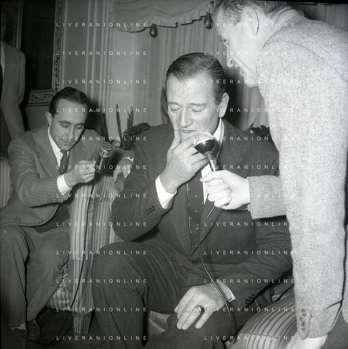 NEG-RETROSPETTIVA JOHN WAYNE ATTORE NELLA FOTO JOHN WAYNE A ROMA IL GIORNO 30-01-1956 A UNA CONFERENZA STAMPA FOTO SANDRO VESPASIANI-AG ALDO LIVERANI SAS