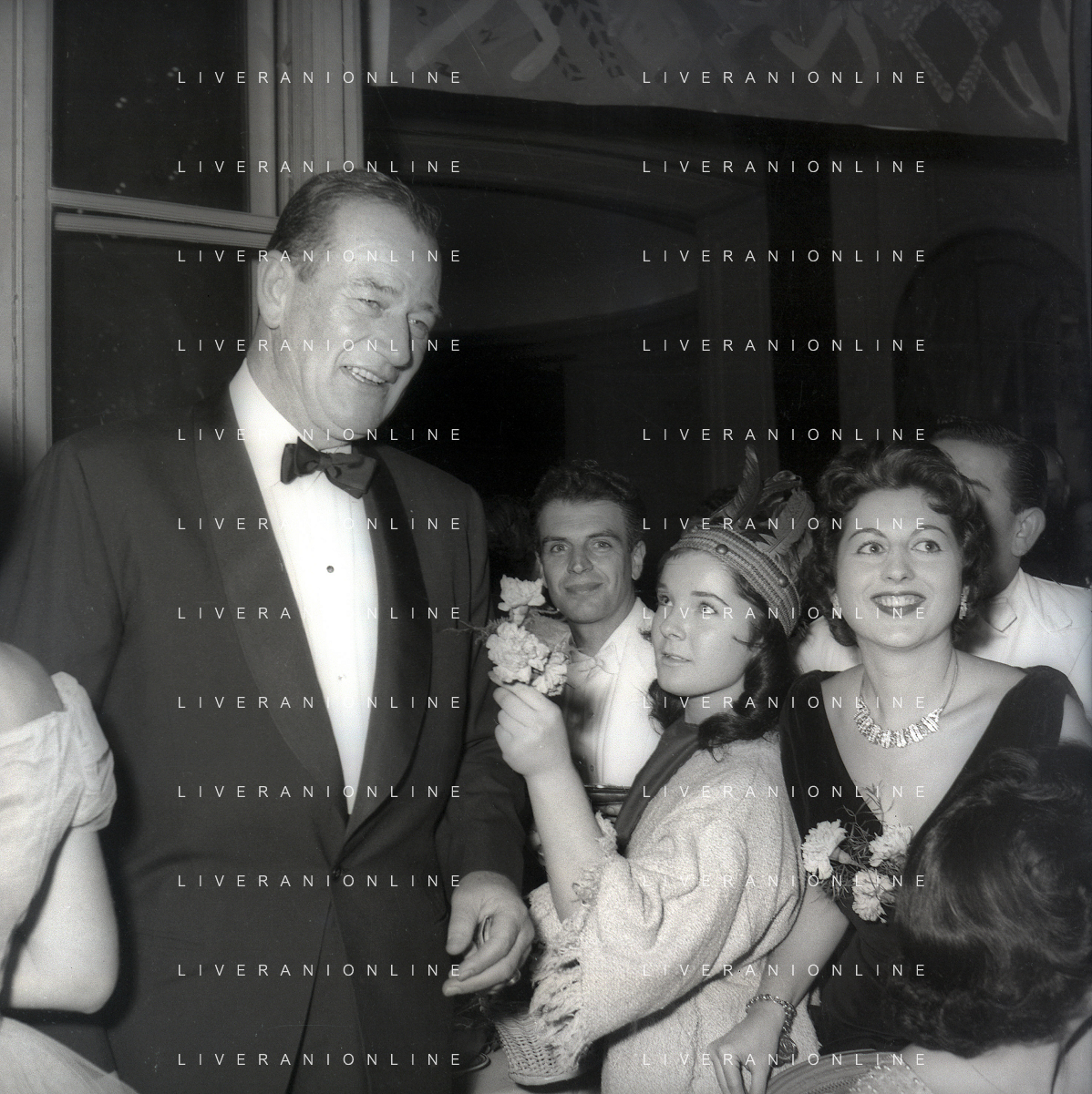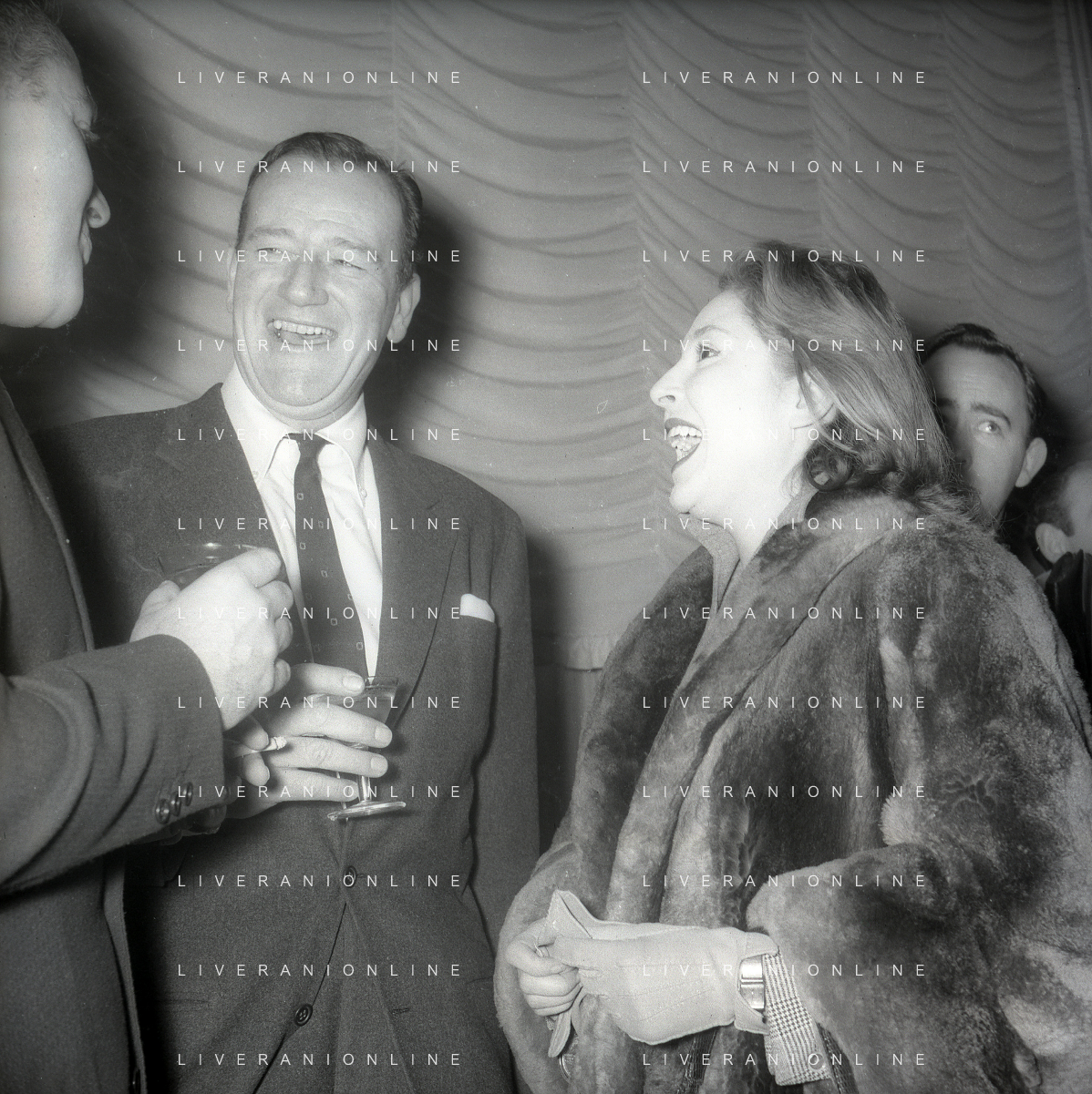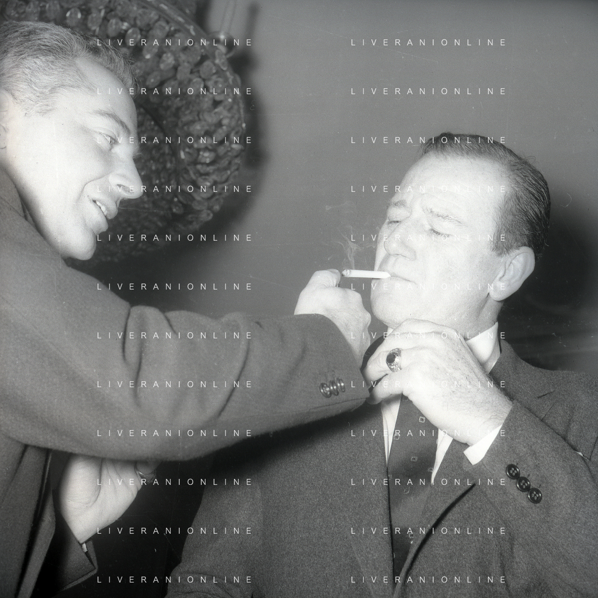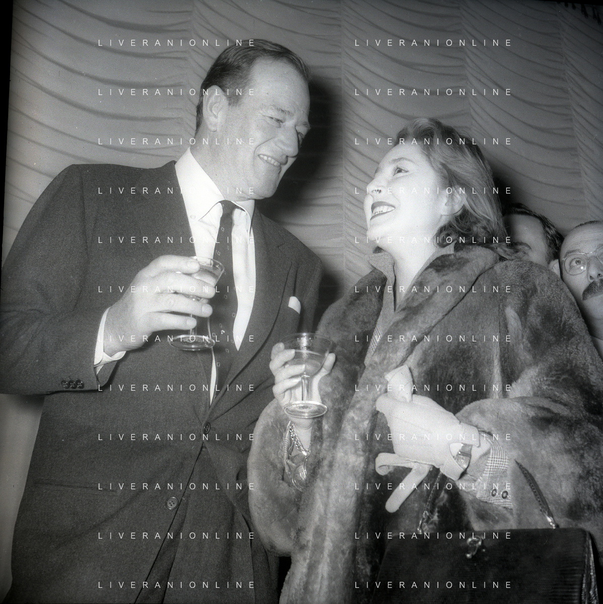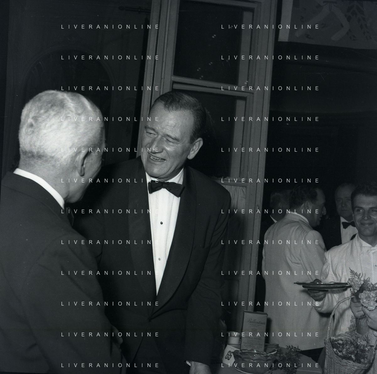 NEG-RETROSPETTIVA JOHN WAYNE ATTORE NELLA FOTO JOHN WAYNE A ROMA IL GIORNO 30-01-1956 A UNA CONFERENZA STAMPA FOTO SANDRO VESPASIANI-AG ALDO LIVERANI SAS