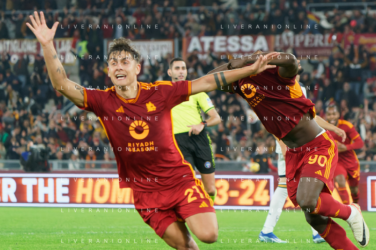 Romelu Lukaku of AS Roma celebrates after scoring a goal with Paulo Dybala of AS Roma during the Italian soccer Serie A match AS Roma vs US Lecce on November 5, 2023 at Olympic Stadium in Rome, Italy. Photo by Emmanuele Mastrodonato/ag. Aldo Liverani sas