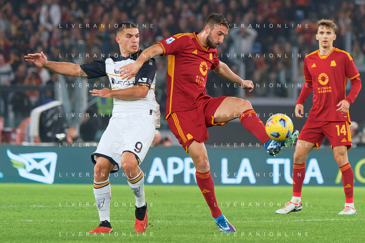 Bryan Cristante of AS Roma and Nikola Krstovic of US Lecce during the Italian soccer Serie A match AS Roma vs US Lecce on November 5, 2023 at Olympic Stadium in Rome, Italy. Photo by Emmanuele Mastrodonato/ag. Aldo Liverani sas