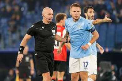 the referee Szymon Marciniak of Poland and Ciro Immobile of SS Lazio during the UEFA Champions League match SS Lazio vs Feyenoord at the Olympic stadium in Rome on November 7, 2023. Photo Emmanuele Mastrodonato/ag. Aldo Liverani sas/AGENZIA ALDO LIVERANI SAS