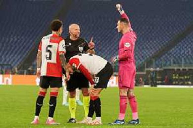 Players of Feyenoord protests with the referee Szymon Marciniak of Poland during the UEFA Champions League match SS Lazio vs Feyenoord at the Olympic stadium in Rome on November 7, 2023. Photo Emmanuele Mastrodonato/ag. Aldo Liverani sas/AGENZIA ALDO LIVERANI SAS