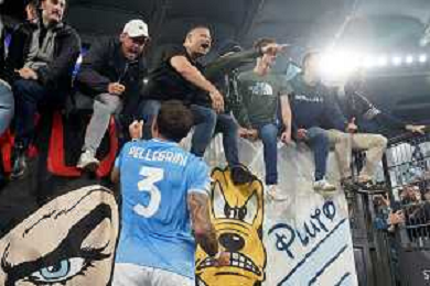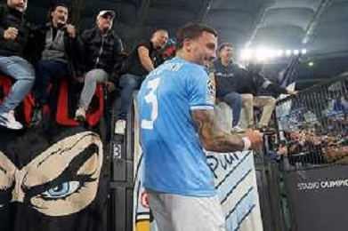 Luca Pellegrini of SS Lazio celebrates the victory with fans during the UEFA Champions League match SS Lazio vs Feyenoord at the Olympic stadium in Rome on November 7, 2023. Photo Emmanuele Mastrodonato/ag. Aldo Liverani sas/AGENZIA ALDO LIVERANI SAS