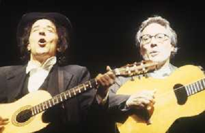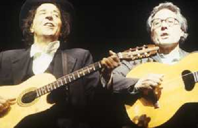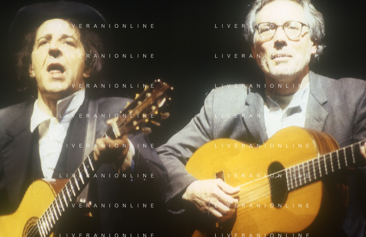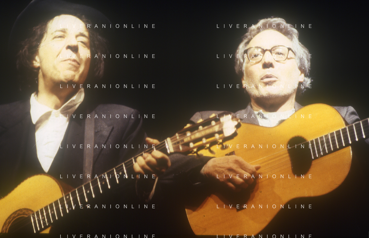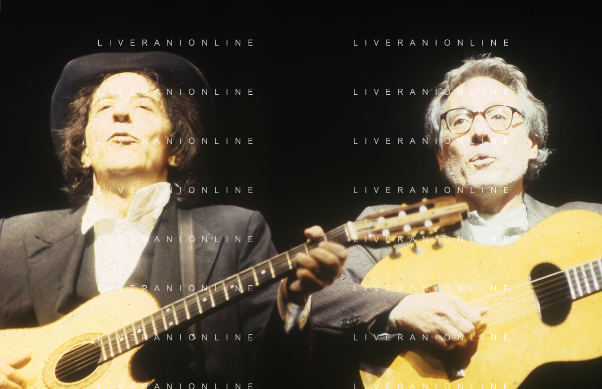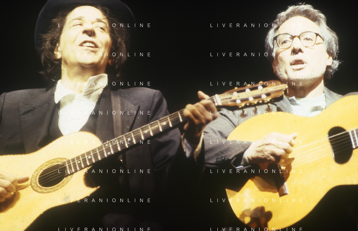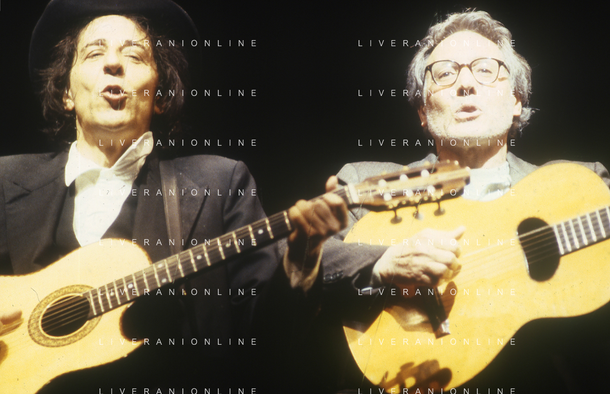 DIAP-RETROSPETTIVA ENZO JANNACCI CANTANTE NELLA FOTO ENZO JANNACCI NELL'ANNO 1987 CON GIORGIO GABER NELLO SPETTACOLO“ASPETTANDO GODOT“ A MILANO AG ALDO LIVERANI SAS
