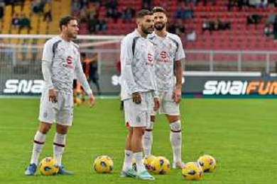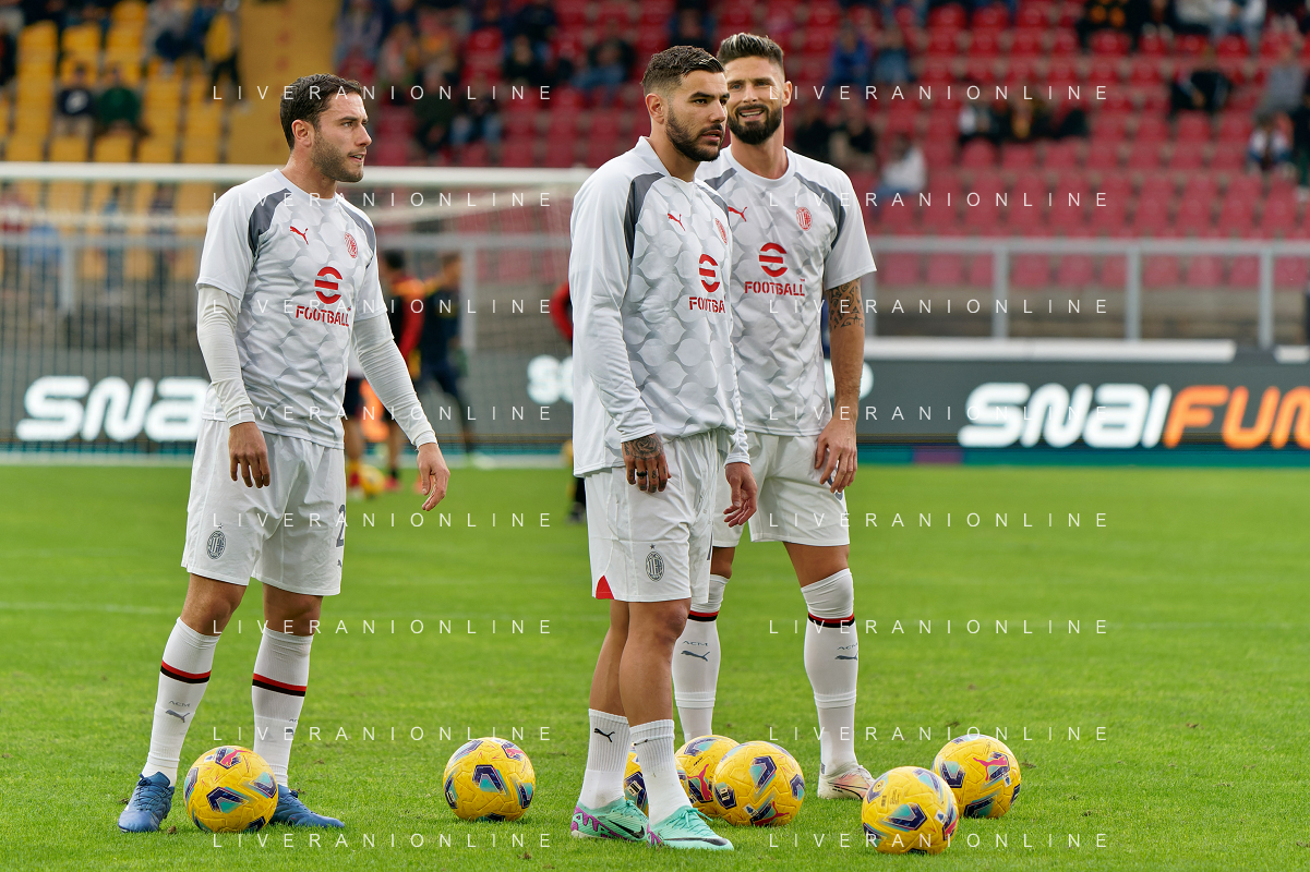 Theo Hernandez of AC Milan, Olivier Giroud of AC Milan and Davide Calabria of AC Milan warms up during the Italian soccer Serie A match US Lecce vs AC Milan on November 10, 2023 at Via del Mare Stadium in Lecce, Italy. Photo by Emmanuele Mastrodonato/ag. Aldo Liverani sas/AGENZIA ALDO LIVERANI SAS