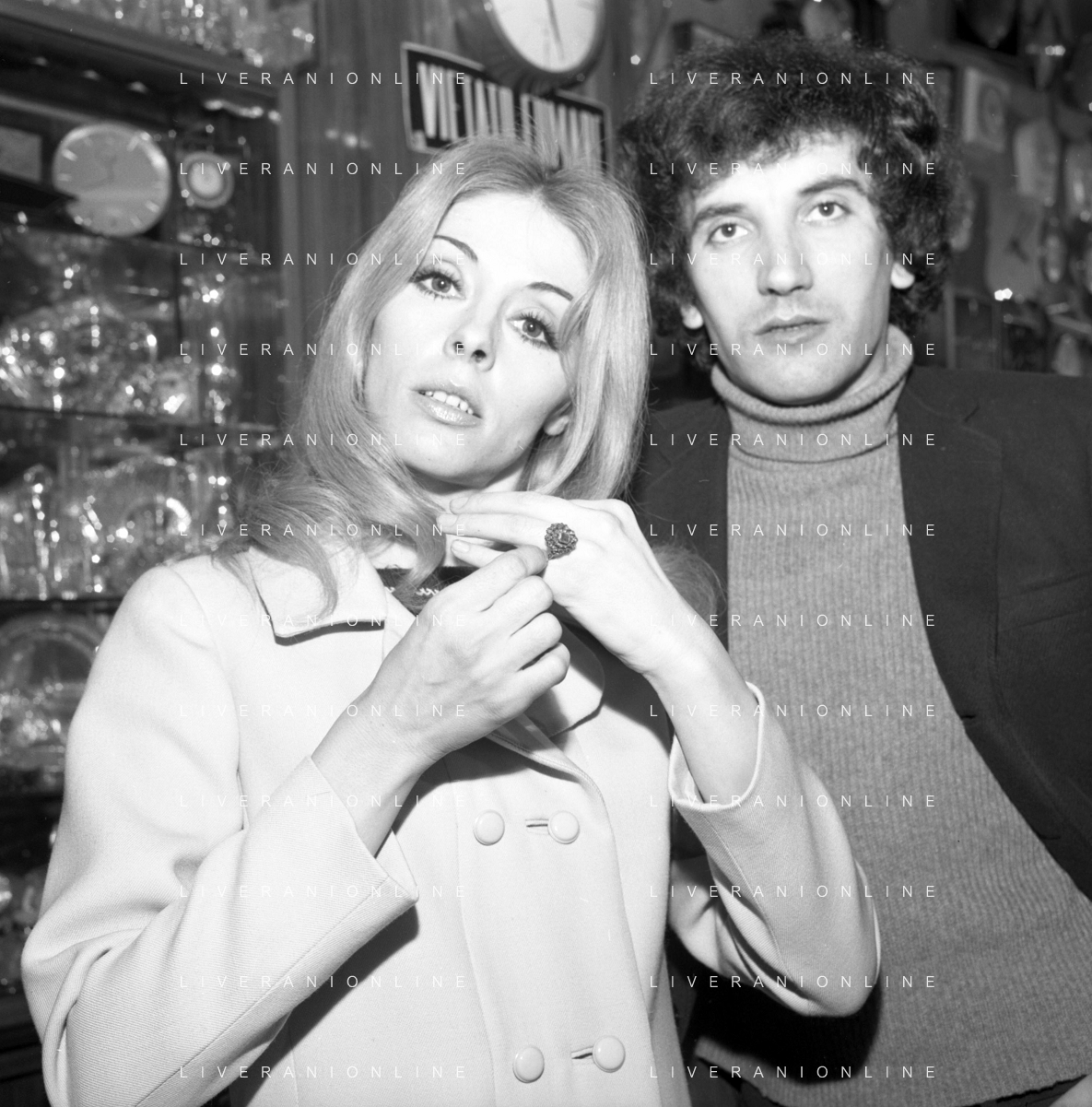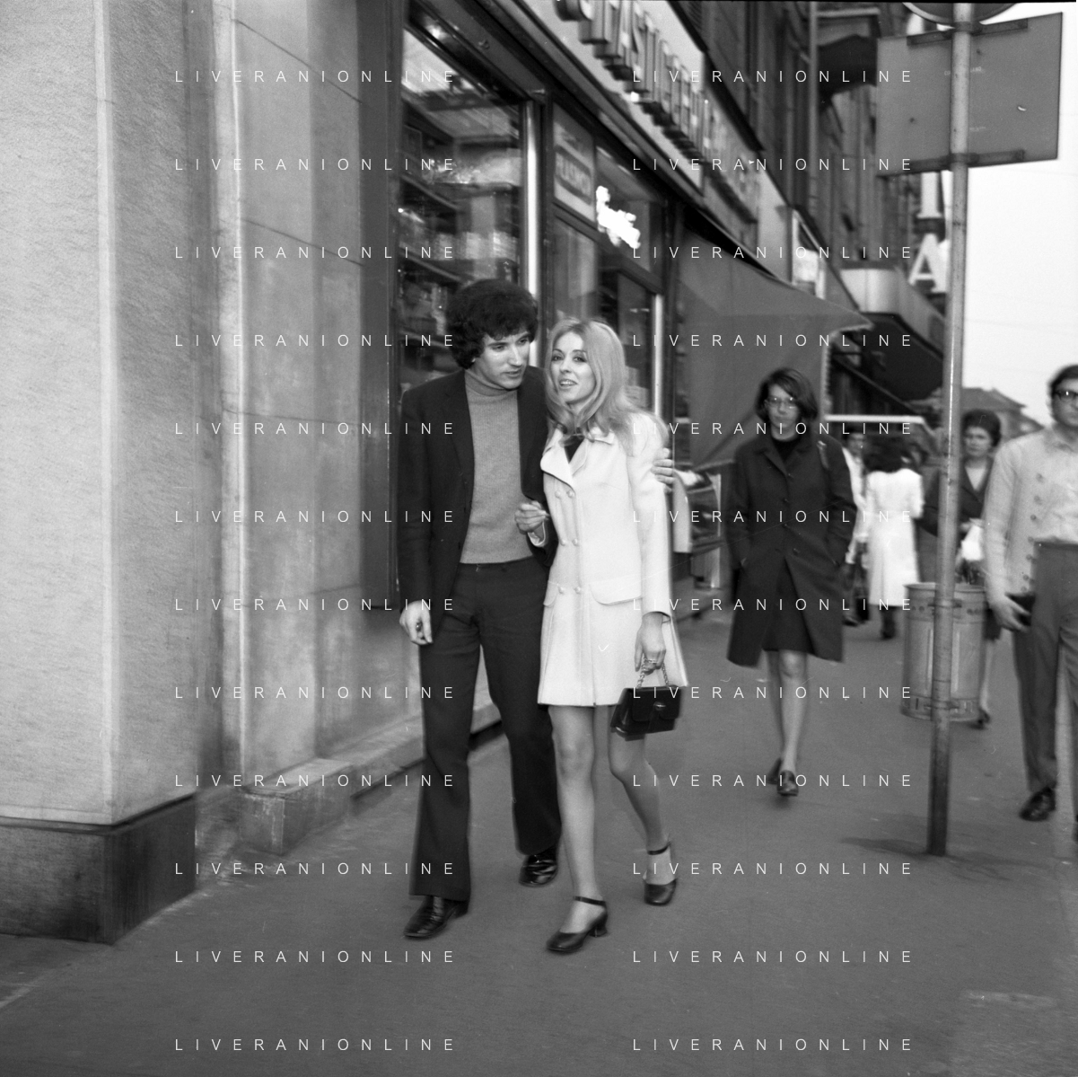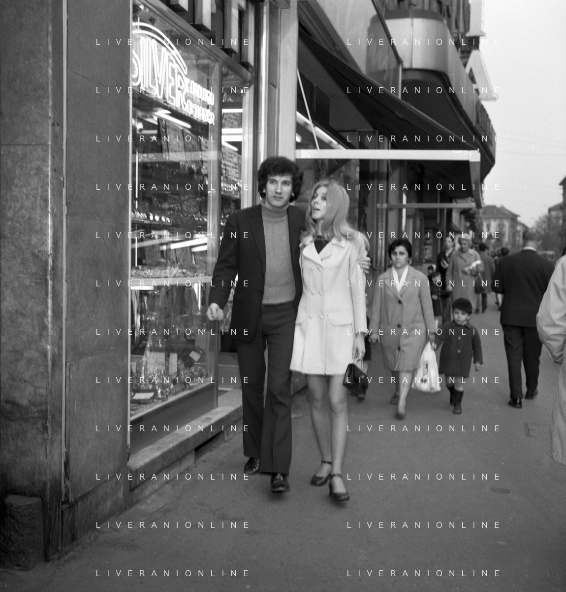 Neg- RETROSPETTIVA VITTORIA SOLINAS (MARIA SOLE) CANTANTE E ATTRICE NELLA FOTO CON IL MARITO ARMANDO STULA PER LE VIE DI MILANO NELL'ANNO 1970 AG ALDO LIVERANI SAS